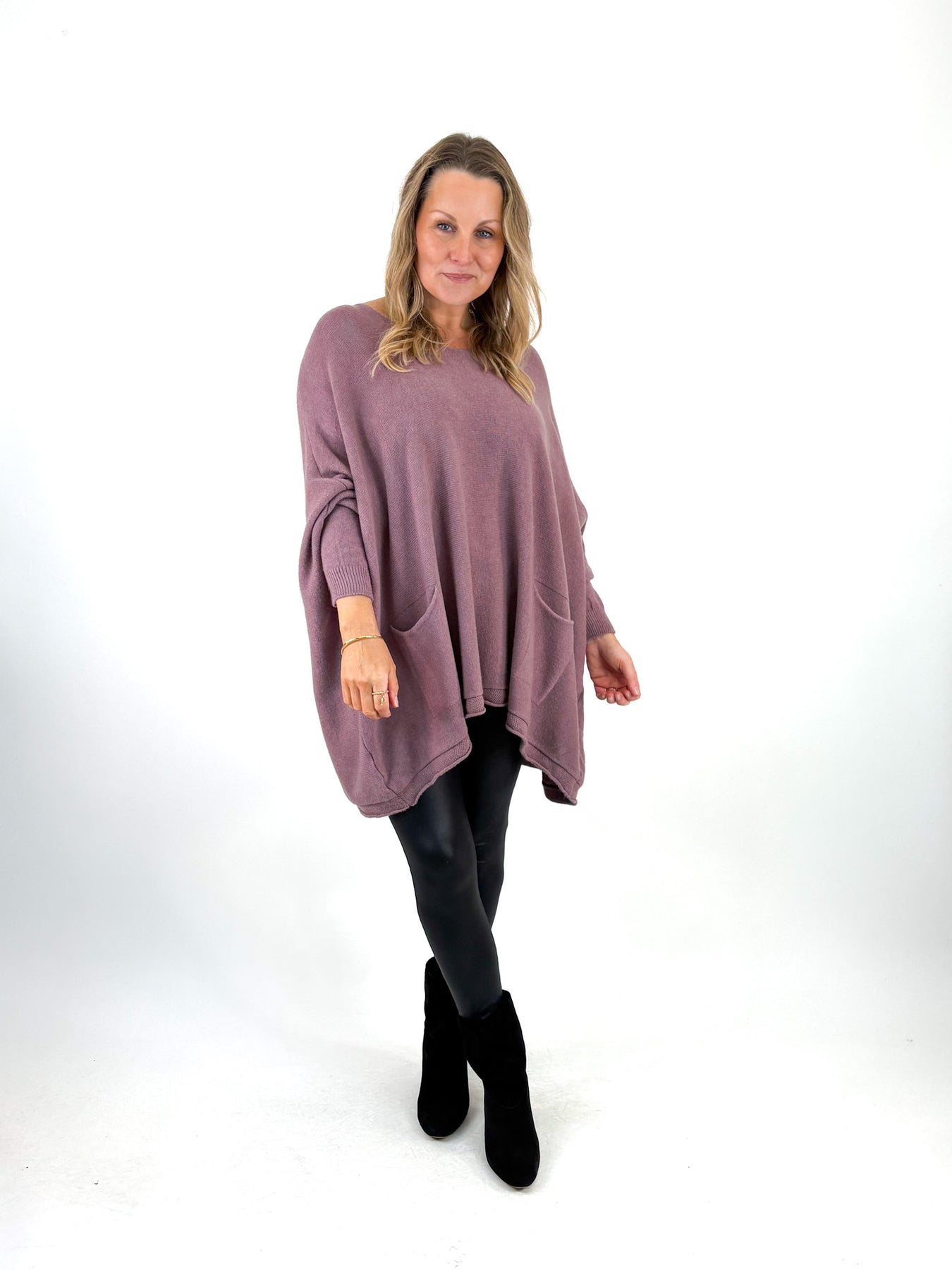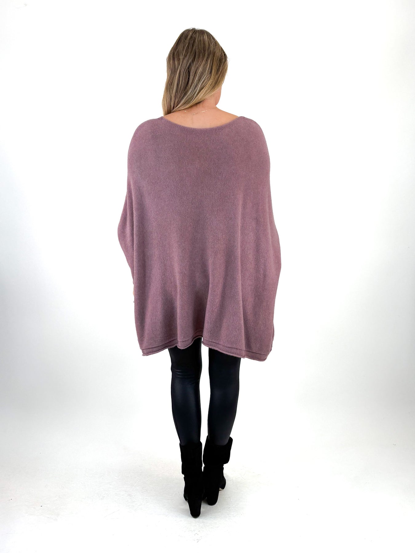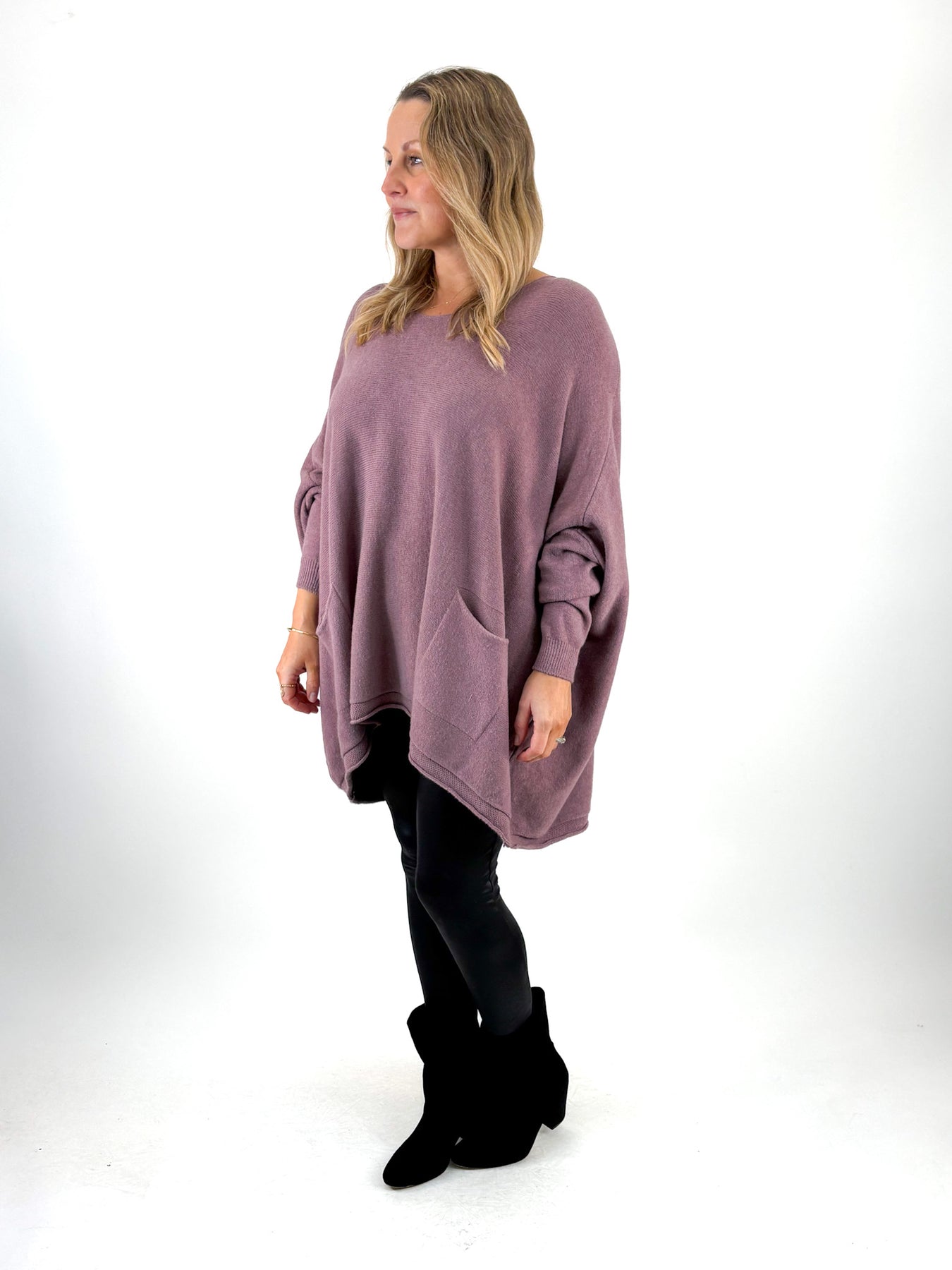- This V Neck Knit is over sized and super soft , Layer over shirts or on its own, its a non itch fabric ! Twin Hip pockets on front.