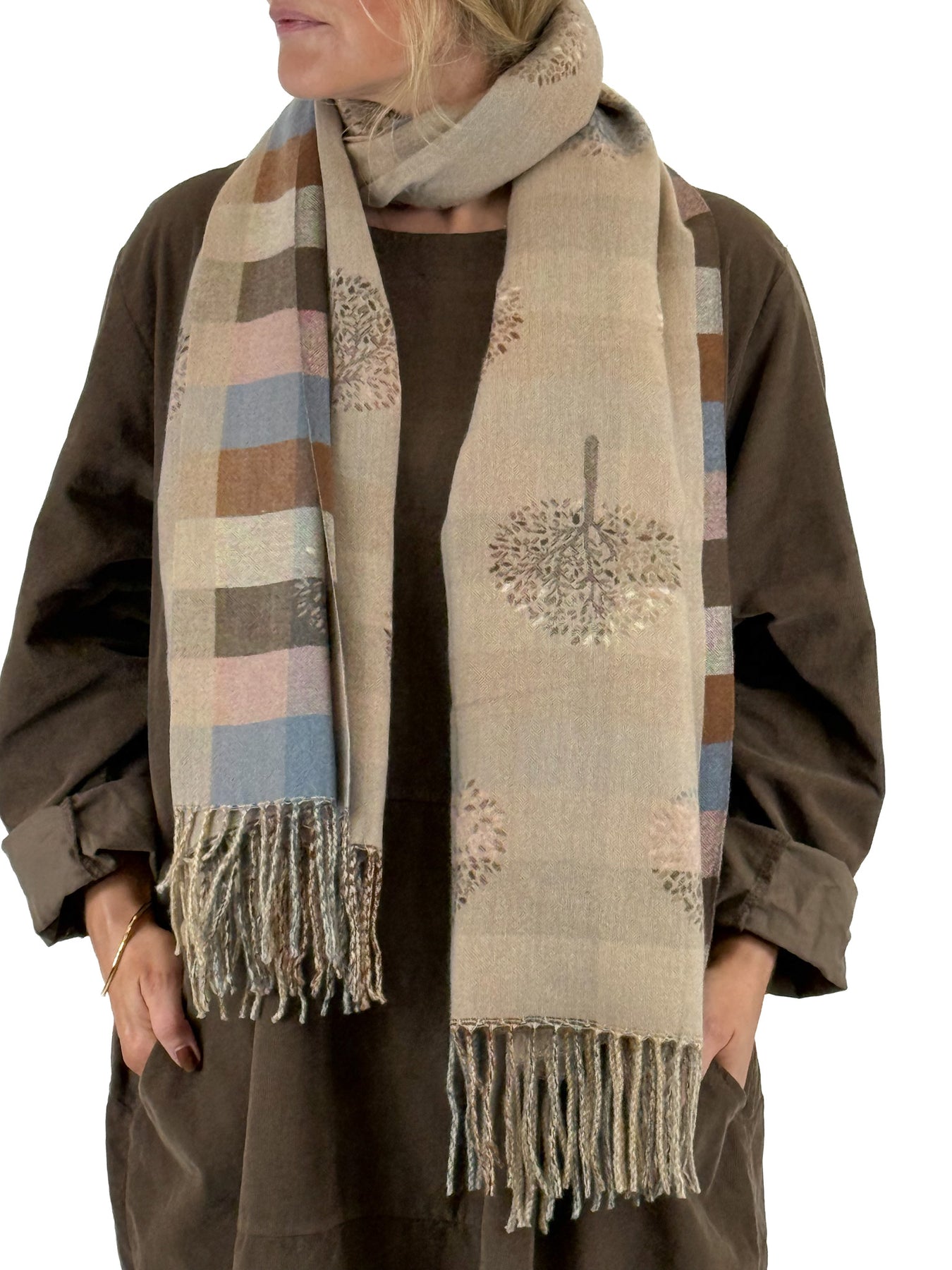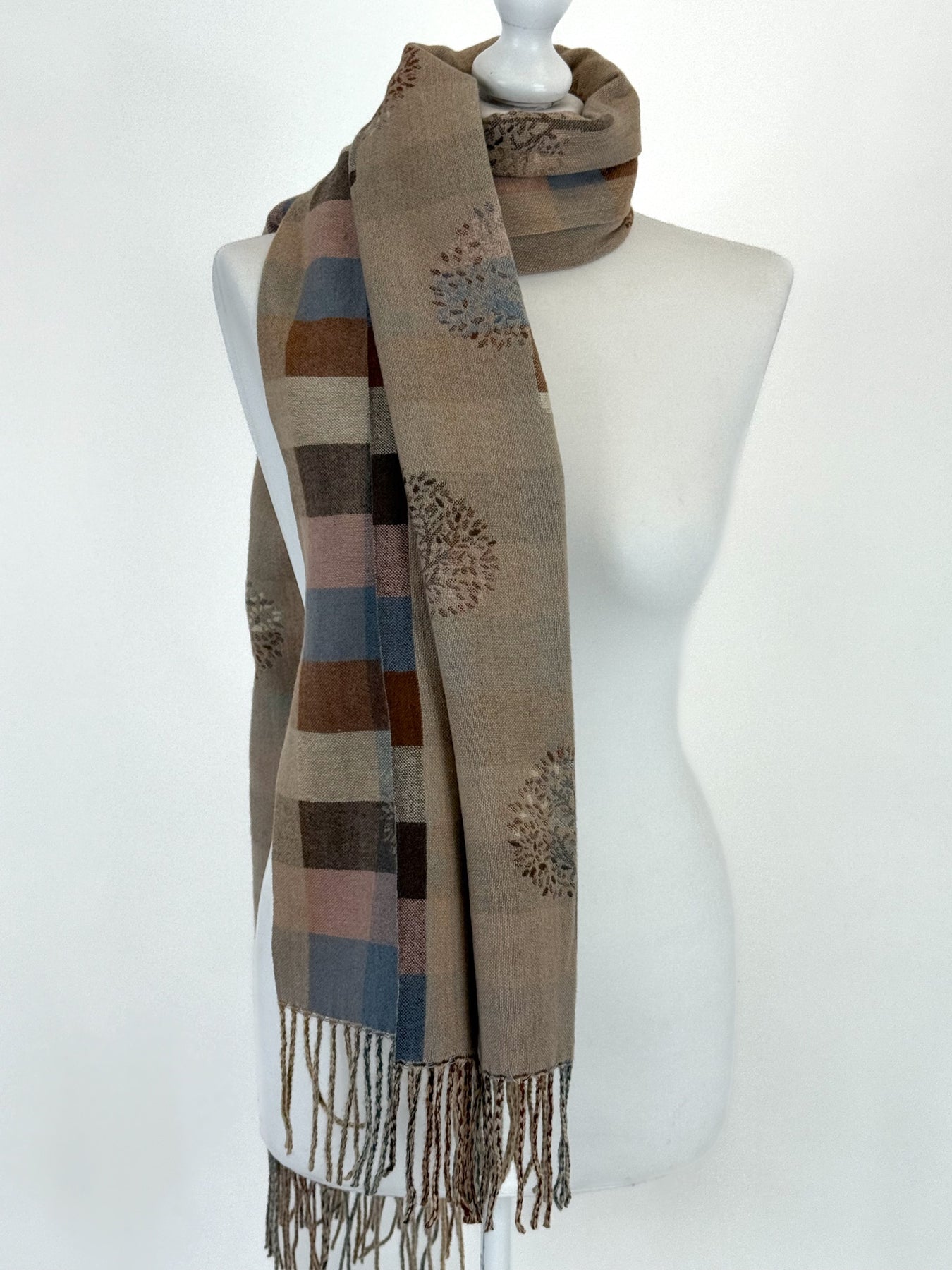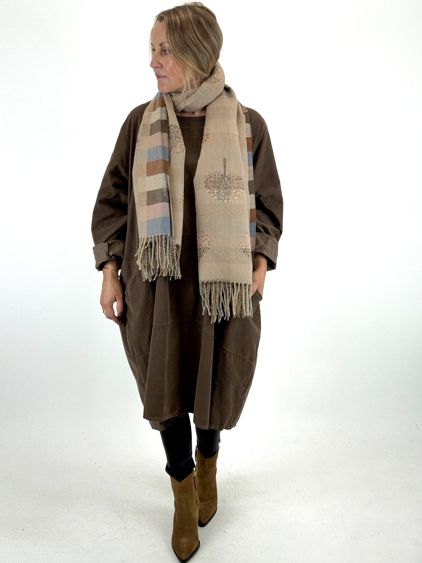 Lagenlook Tree Of Life Scarf in Coffee Check. s6260