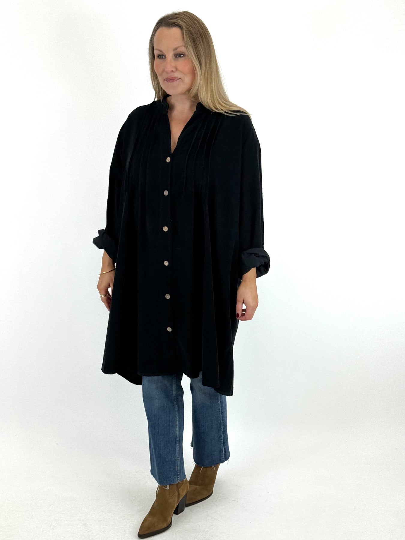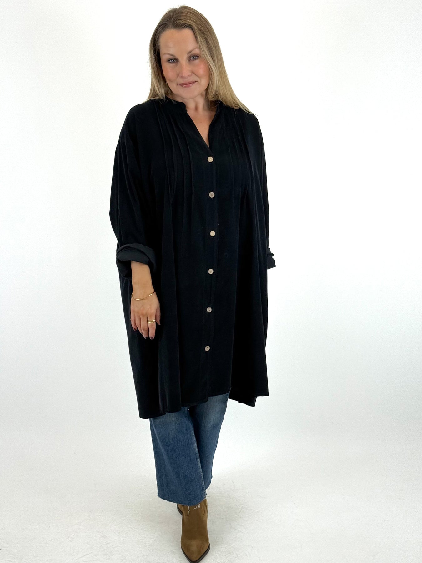 Our beautiful Polly Pin tuck shirt is a must have easy go to for the winter months ahead. A plain cotton corduroy shirt perfect for any occasion. Has Button front so can be worn as a jacket when layering. Corduroy is a must for the winter season.