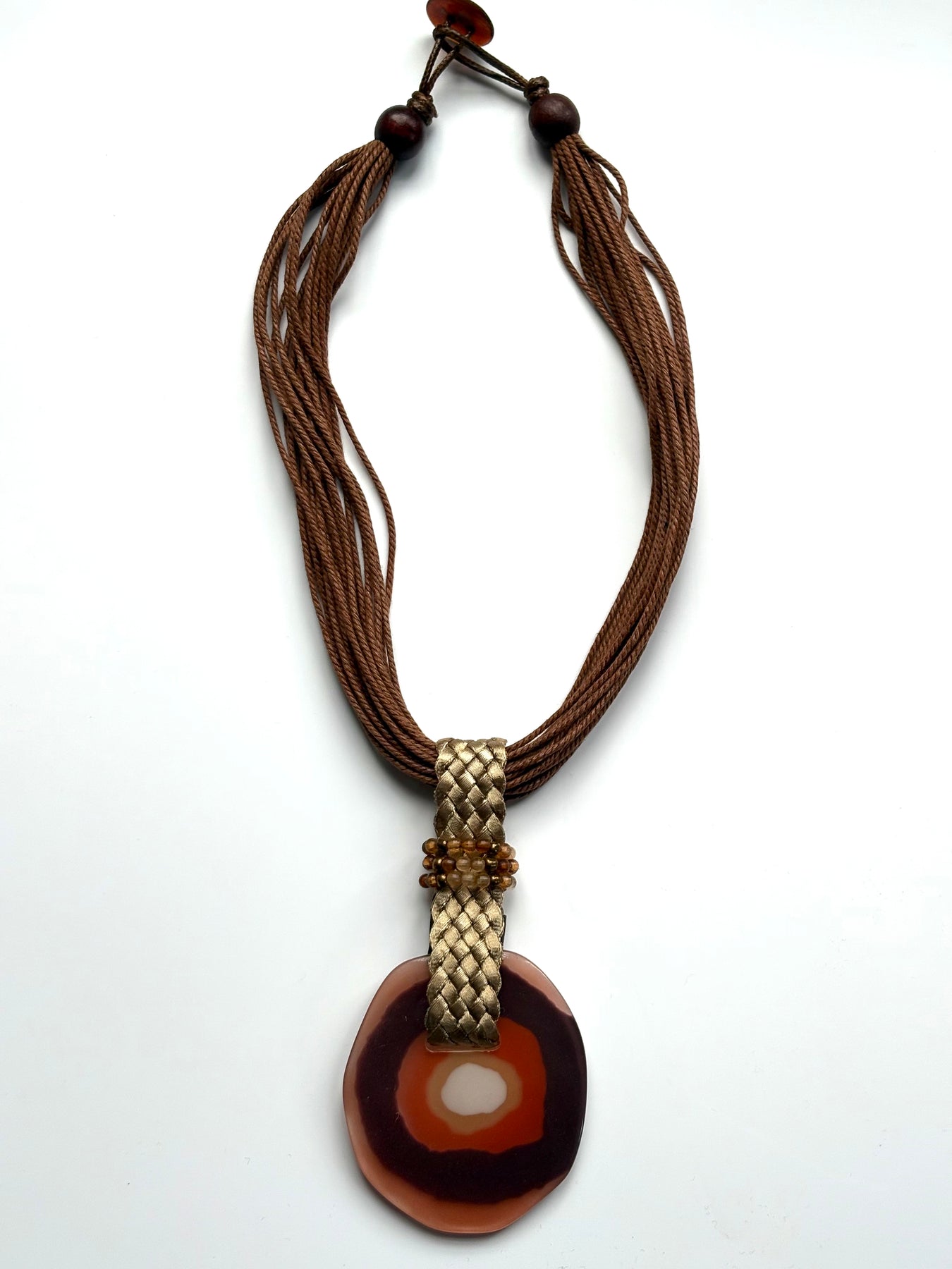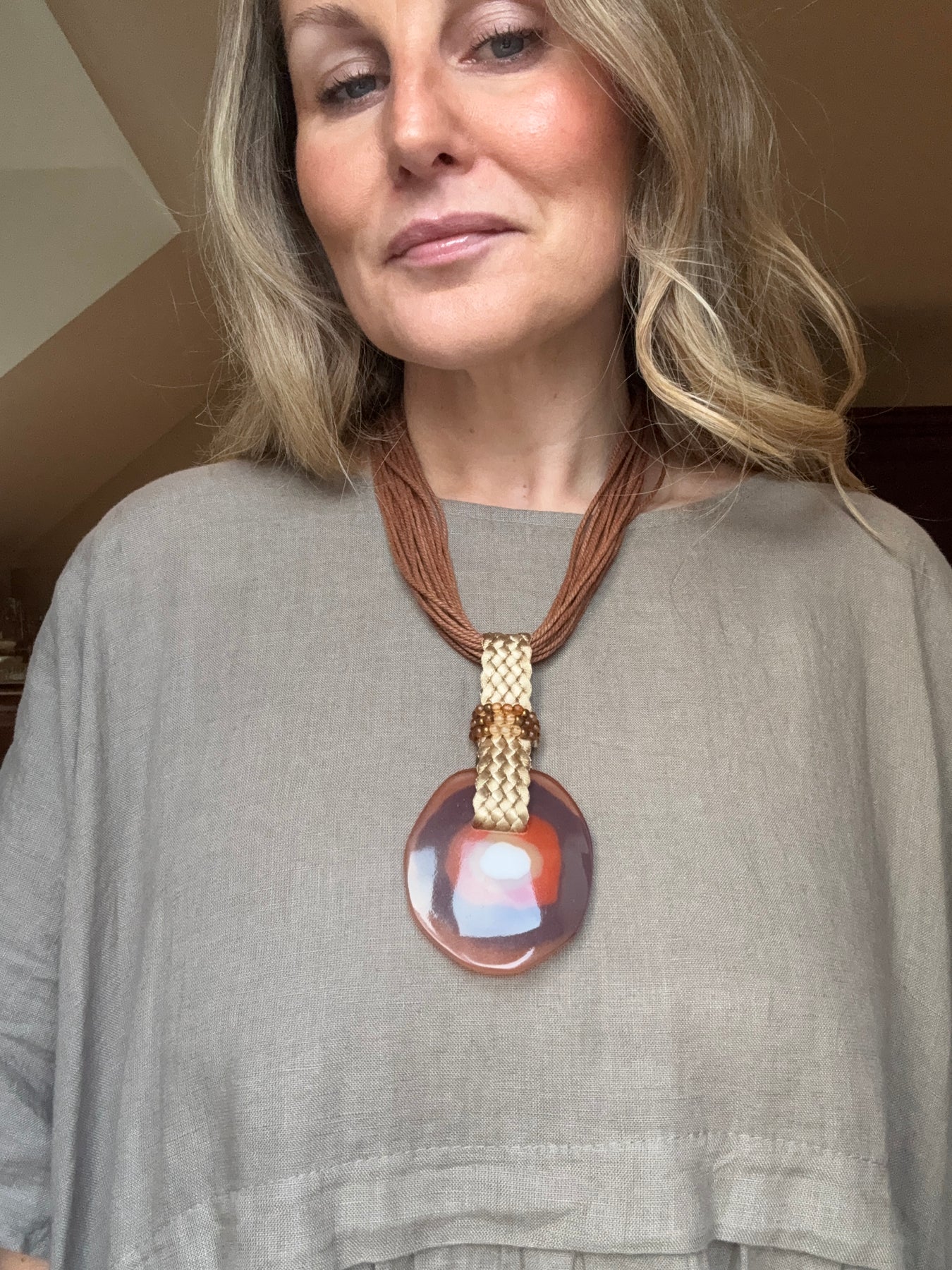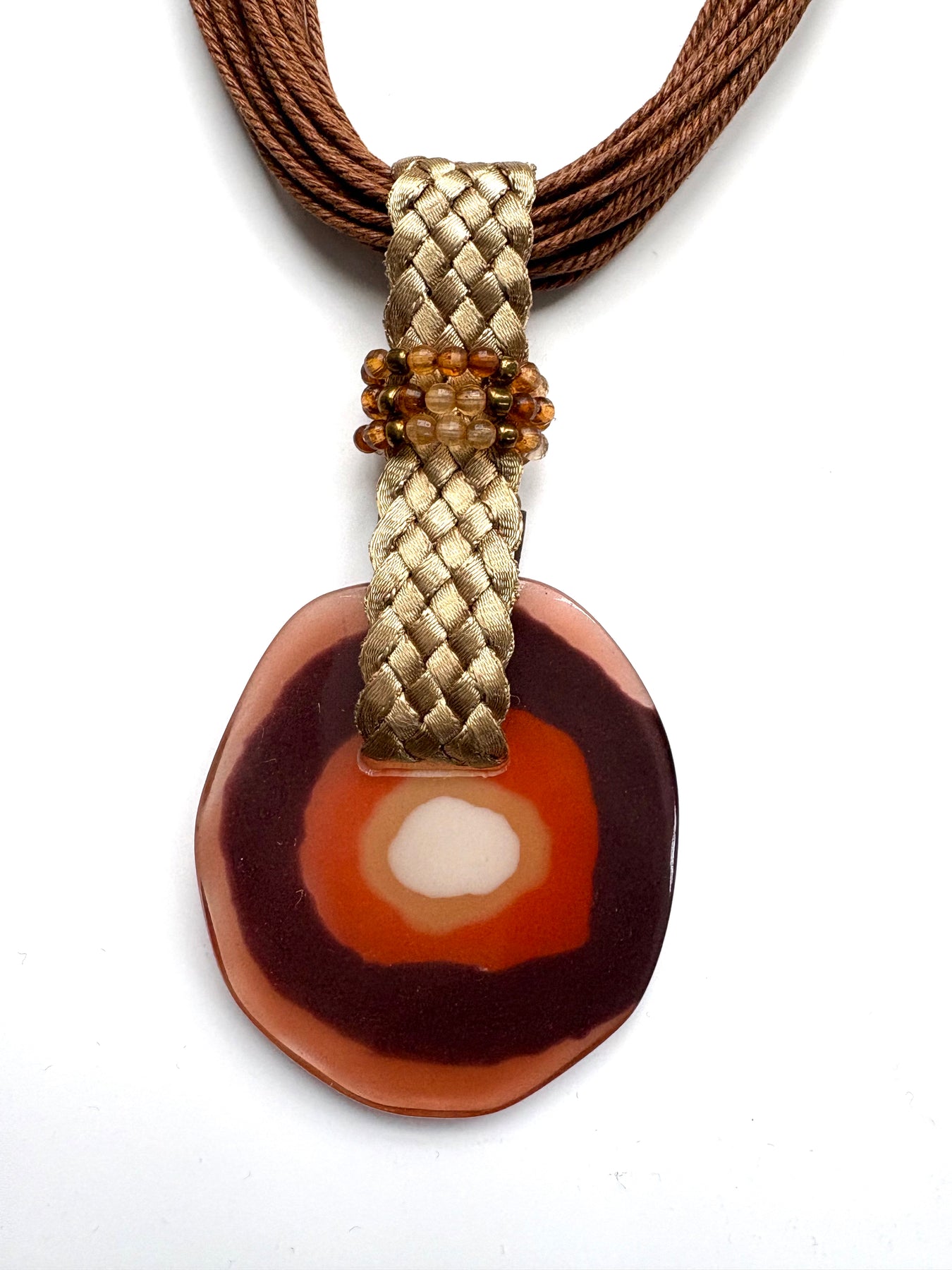 Wax multi cord, resin pendant with muted colours of brown and orange