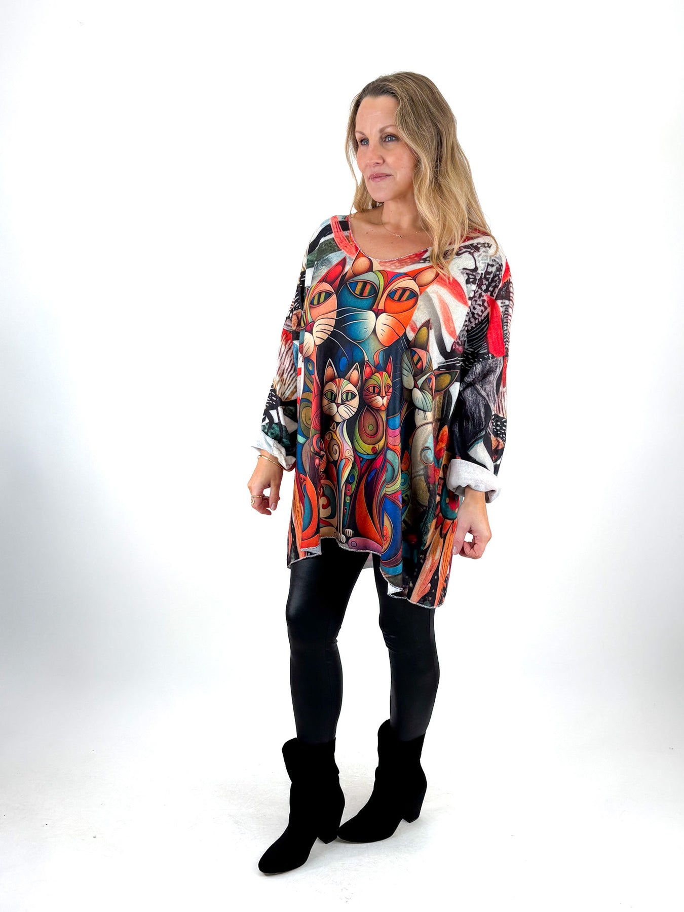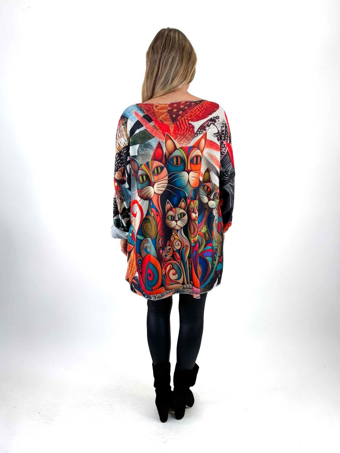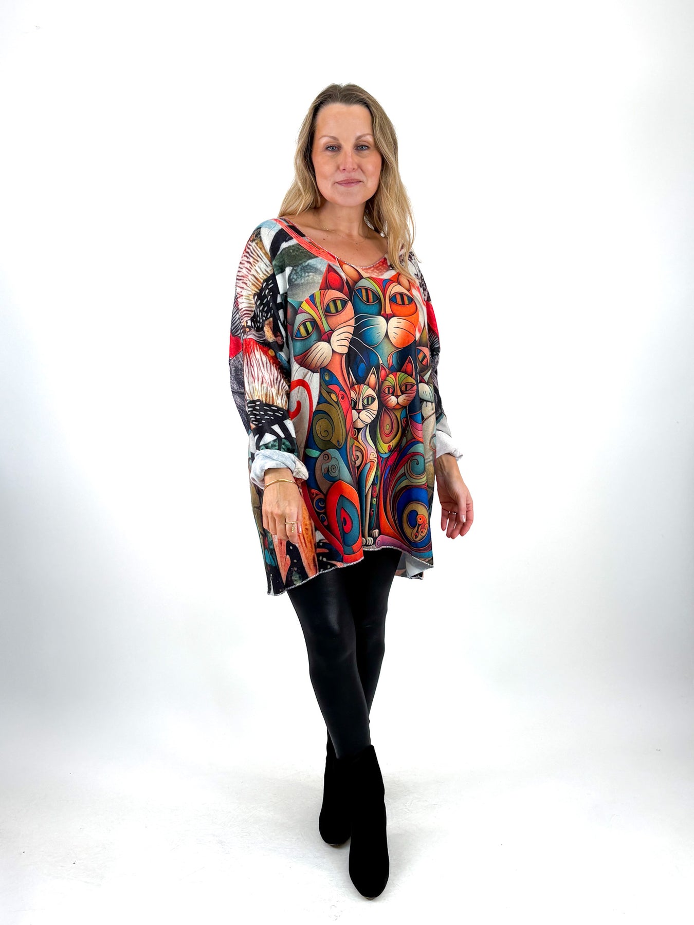 - Lagenlook Made in Italy Cat Crew Top in Multi. 180y