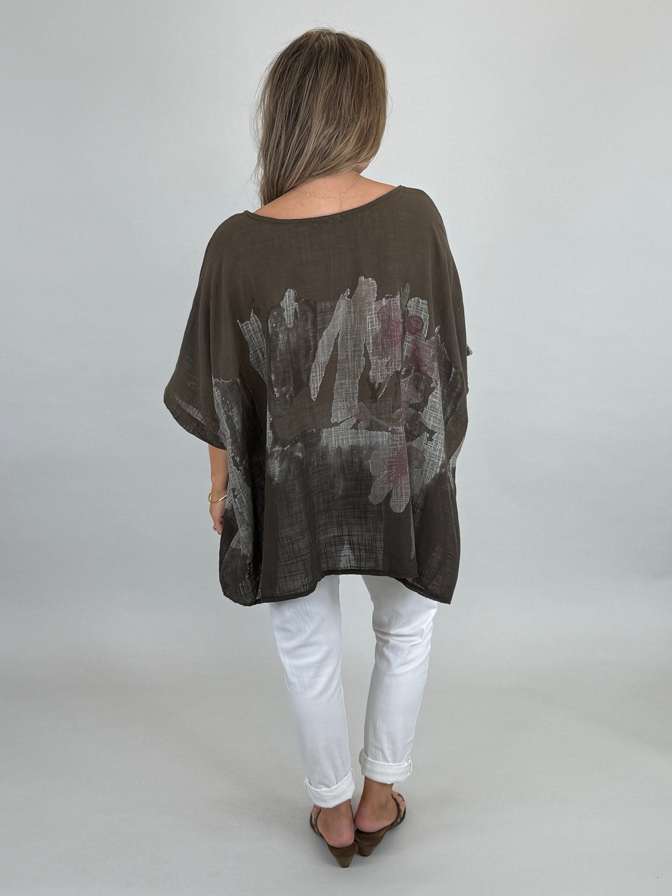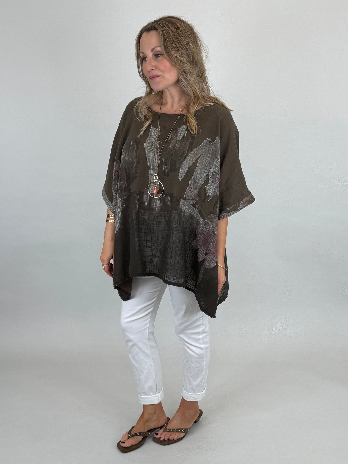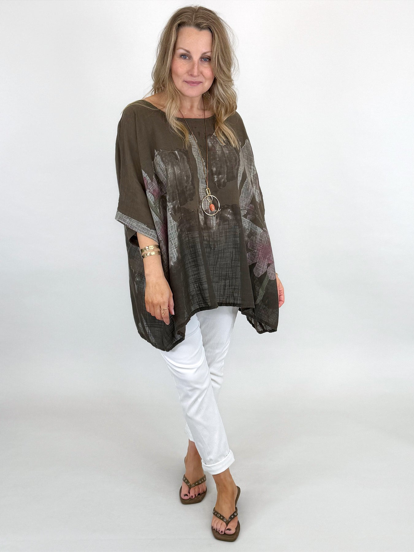 Our beautiful Lagenlook Cotton Connie flower top Statement floral design adds colour without overpowering, ideal with magic pants or linen trousers. Round neckline and short sleeves for all-day comfort.