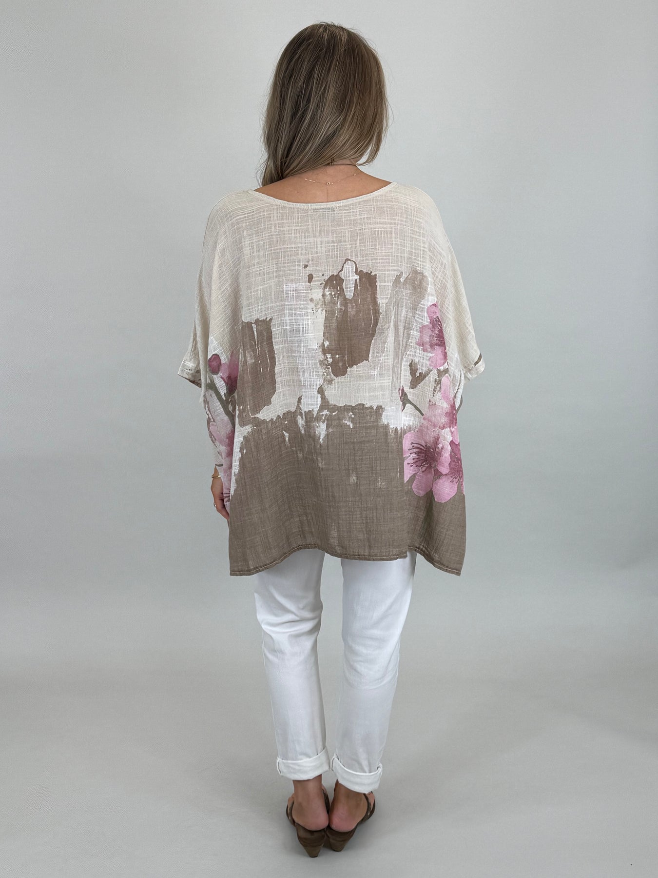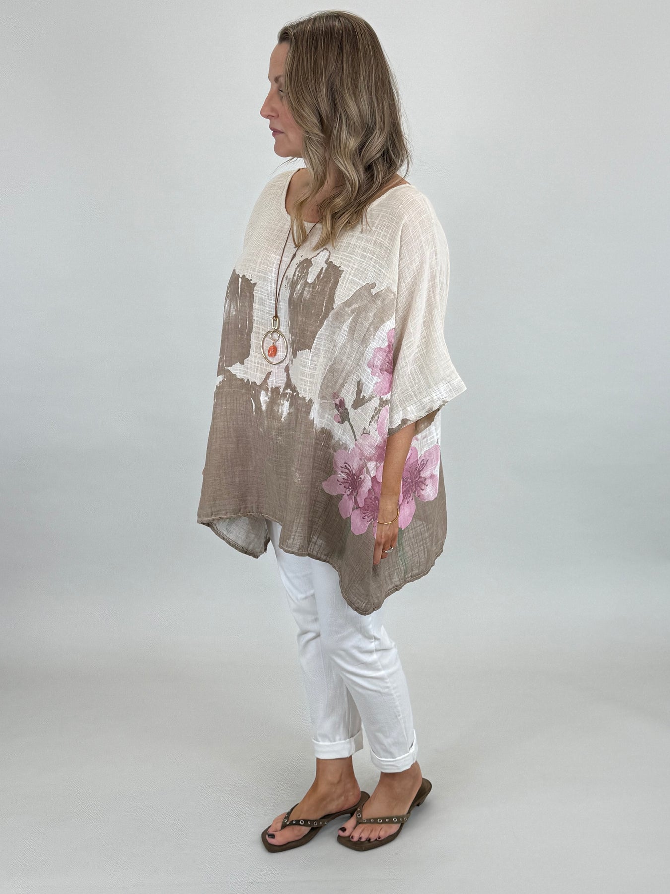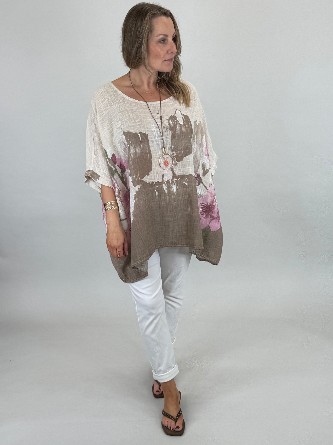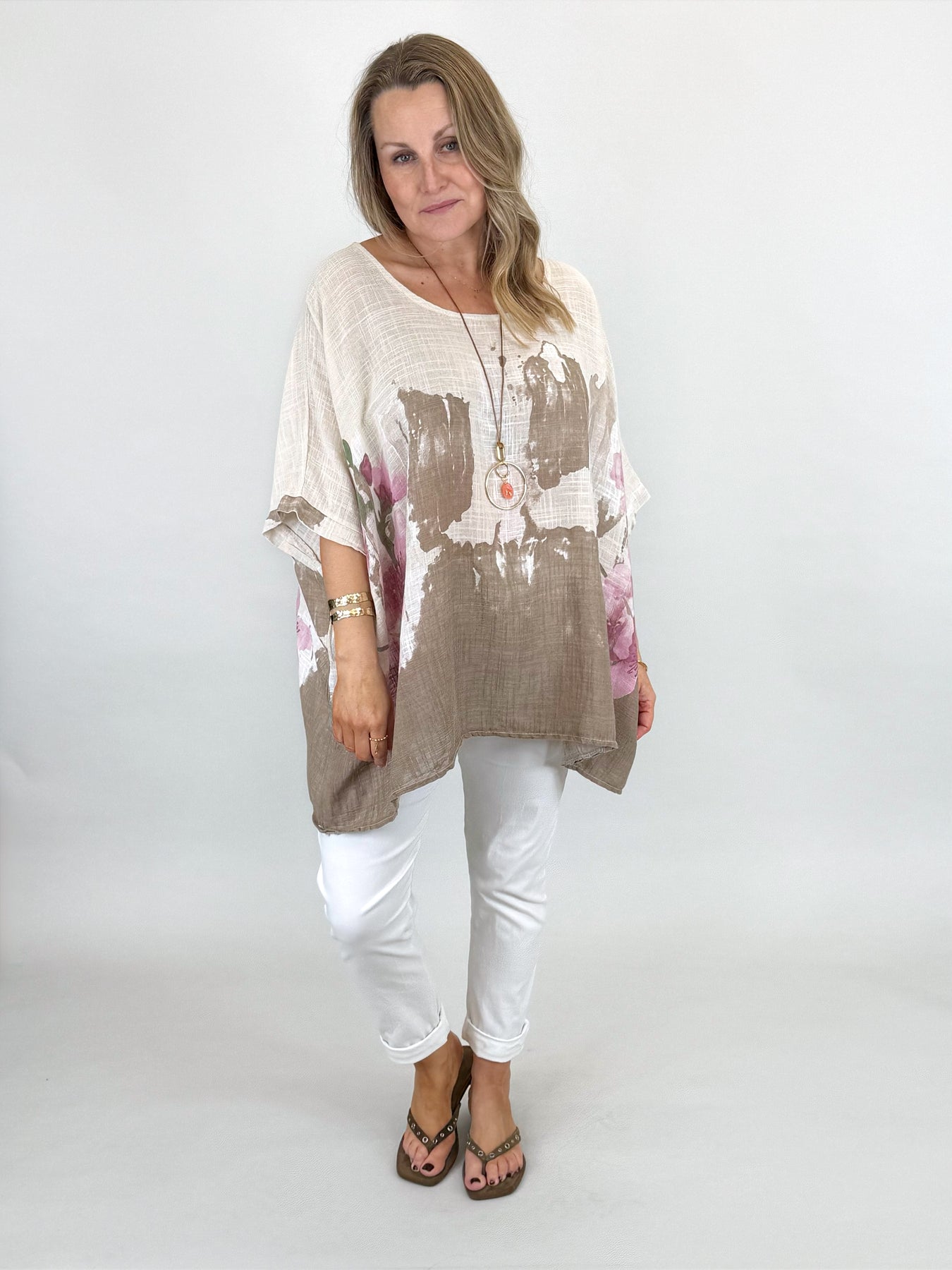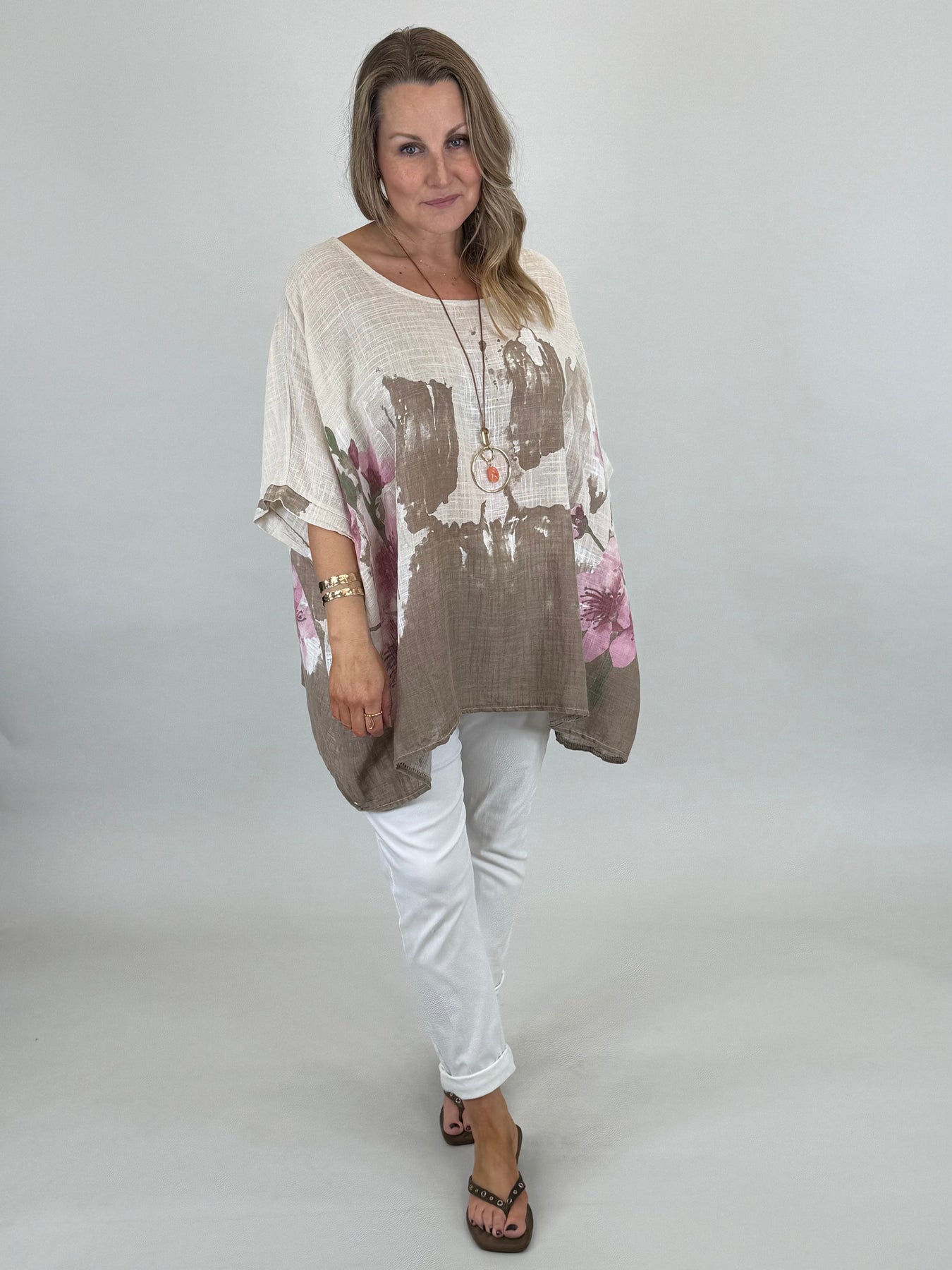Our beautiful Lagenlook Cotton Connie flower top Statement floral design adds colour without overpowering, ideal with magic pants or linen trousers. Round neckline and short sleeves for all-day comfort.