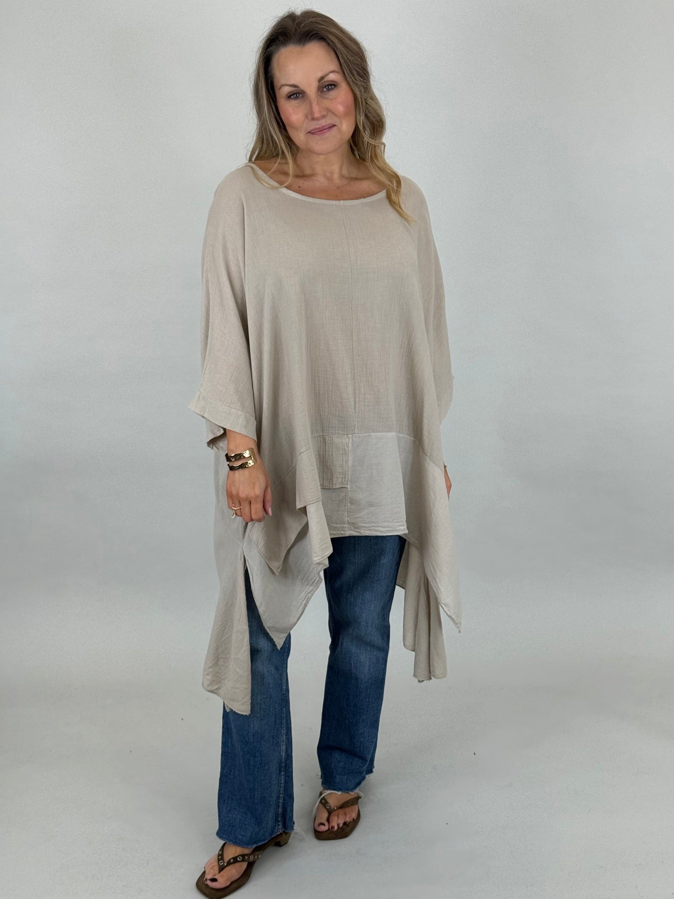 Our beautiful Lagenlook Kim Cotton Top is back. Cut from 100% Italian cotton tailored for a boho drape that looks so stylish. Longer fall on sides