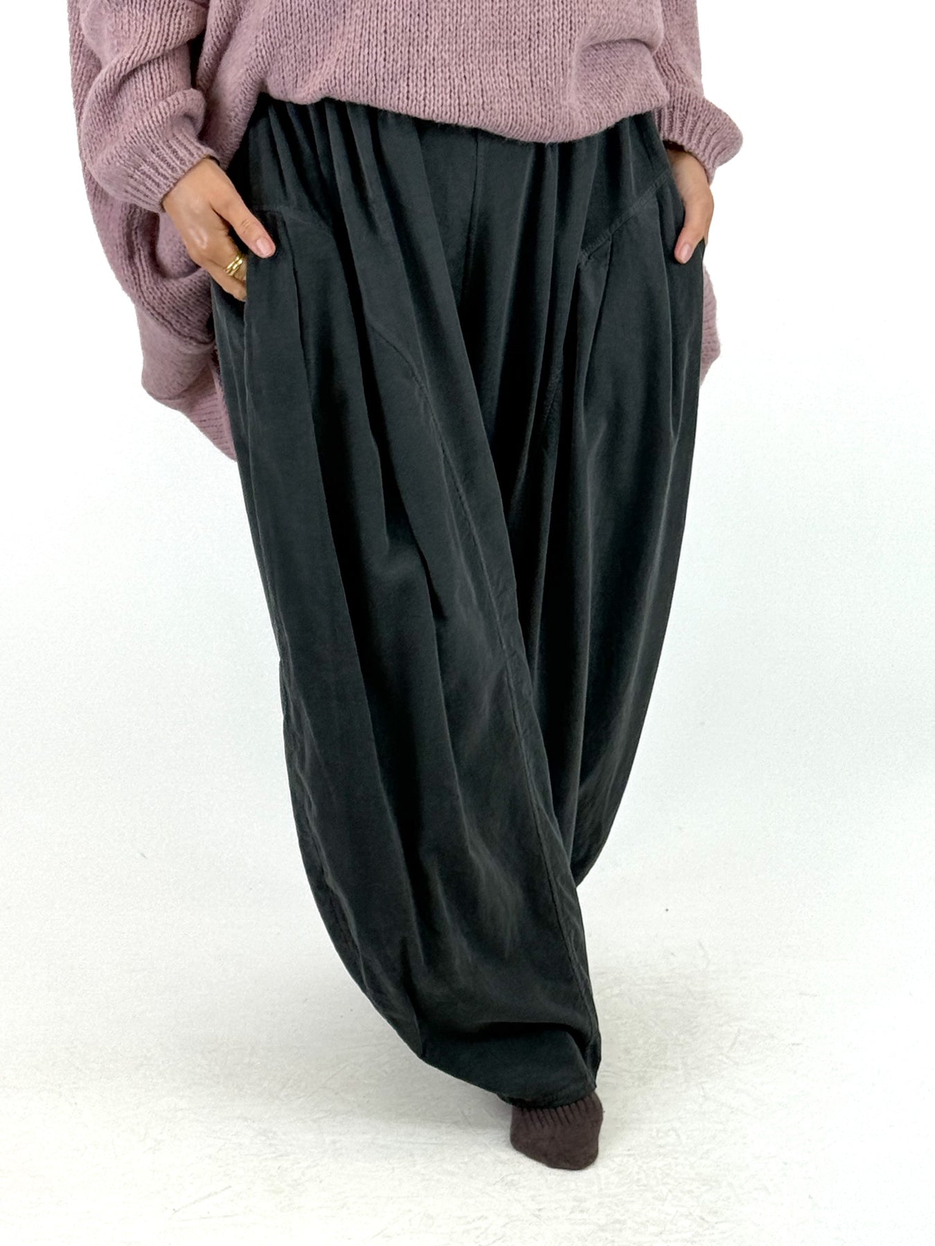 - Made in Italy Lagenlook Corduroy Barrel Cotton Trouser in Charcoal. code 92029