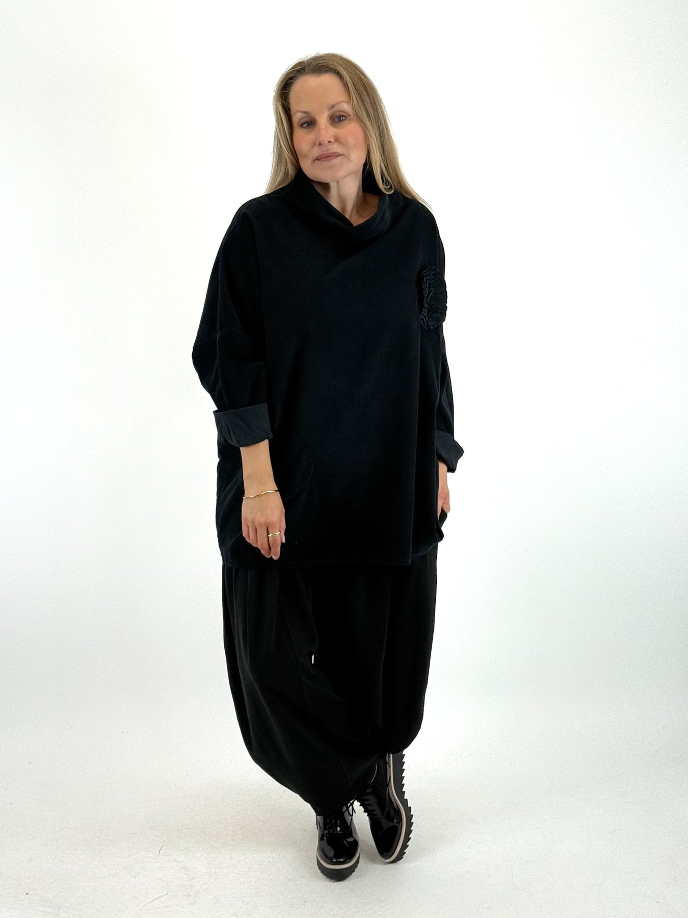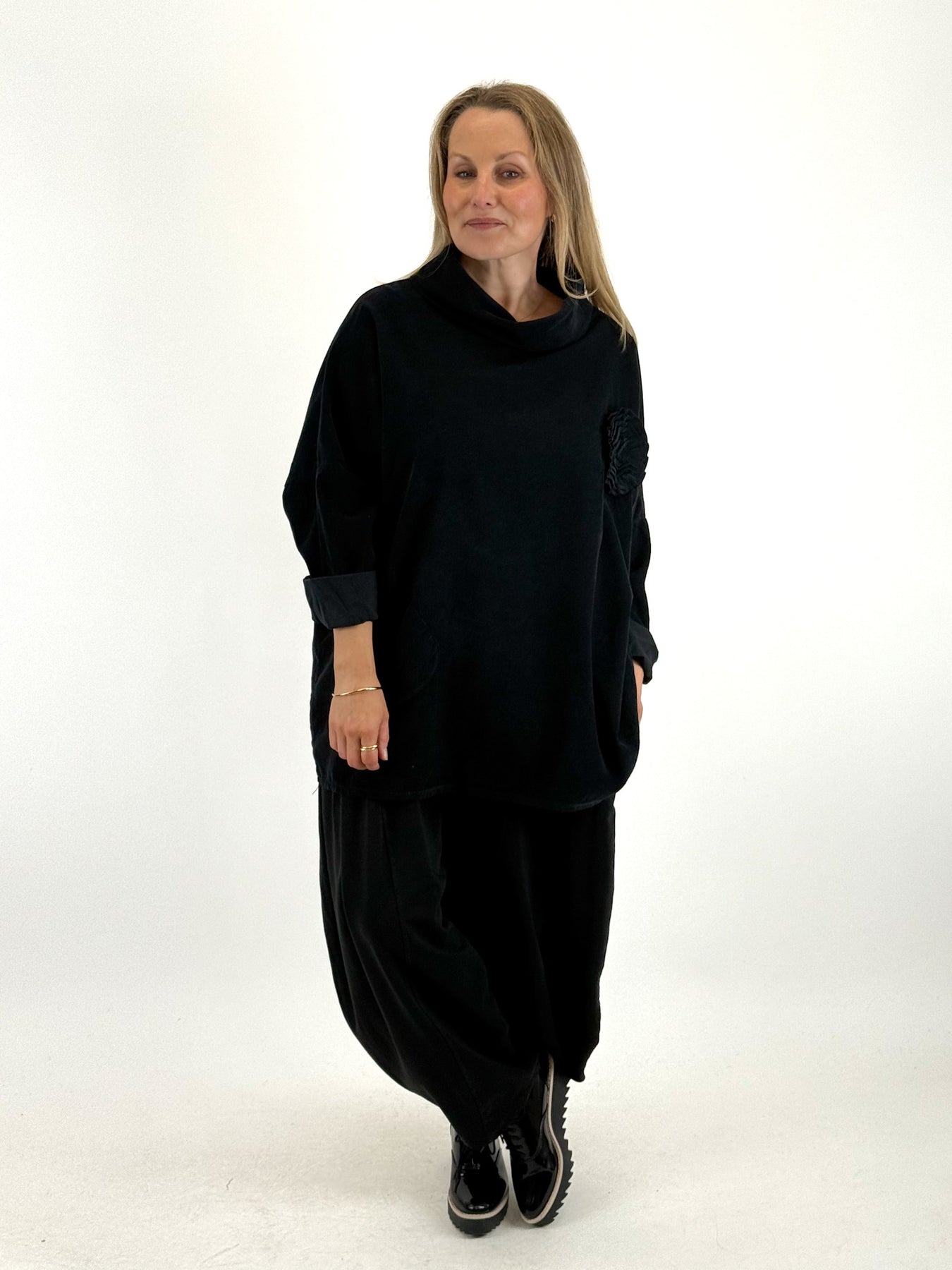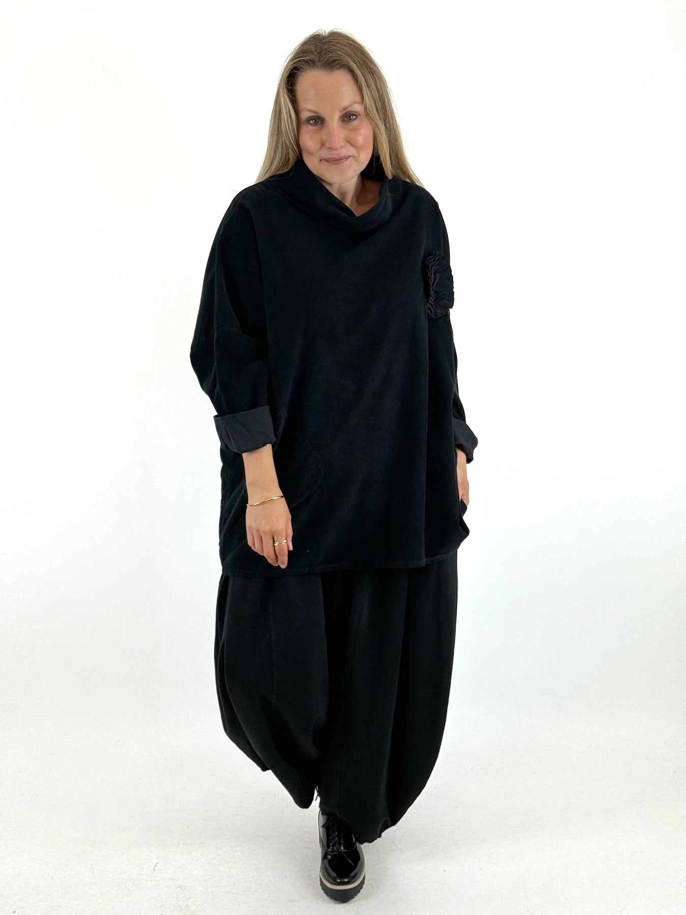 Our beautiful Cowl Neck Top is a must have easy go to for the winter months ahead. A plain cotton corduroy top short block for when the simplest of tops is needed to wear with ease. Has a flower detail, one pocket on the front.