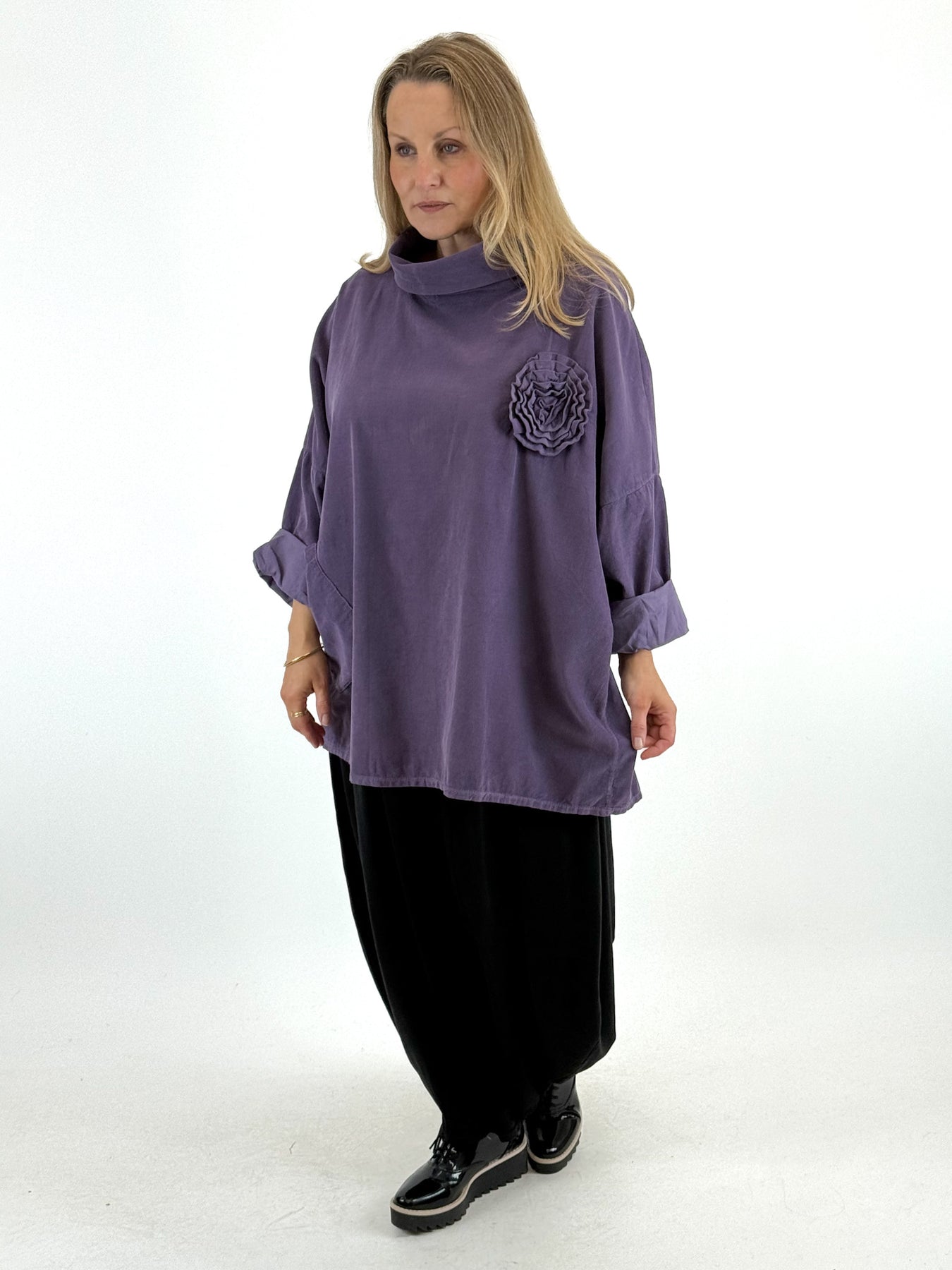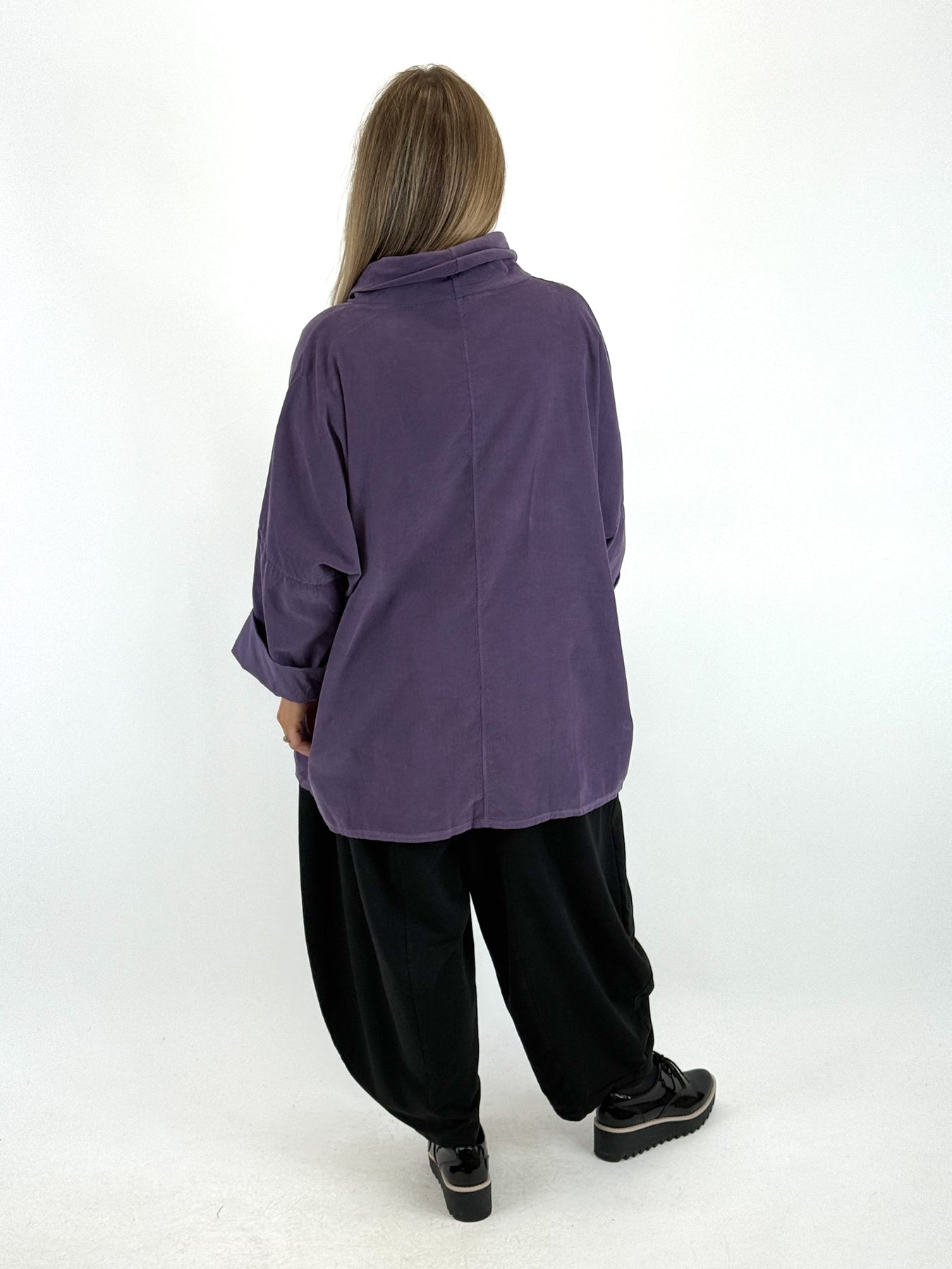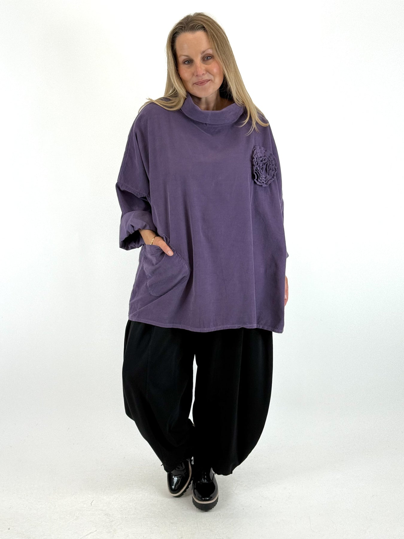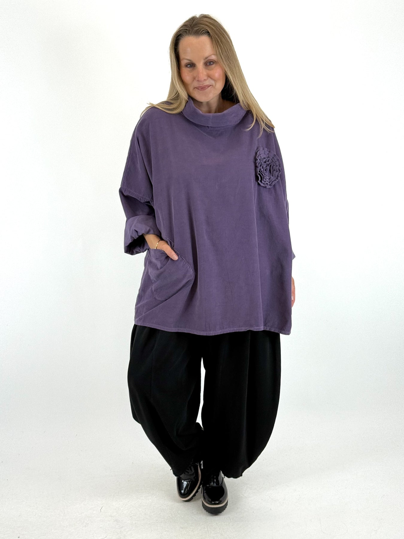 Our beautiful Cowl Neck Top is a must have easy go to for the winter months ahead. A plain cotton corduroy top short block for when the simplest of tops is needed to wear with ease. Has a flower detail, one pocket on the front.