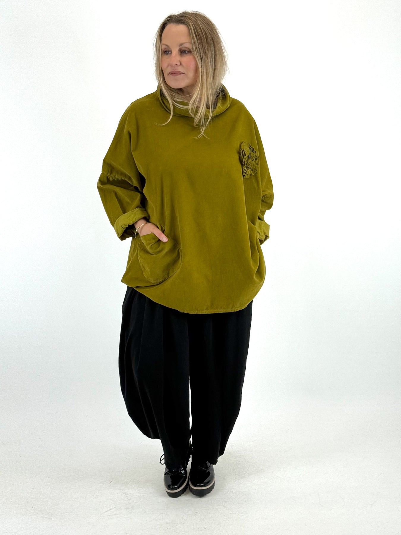 Our beautiful Cowl Neck Top is a must have easy go to for the winter months ahead. A plain cotton corduroy top short block for when the simplest of tops is needed to wear with ease. Has a flower detail, one pocket on the front.