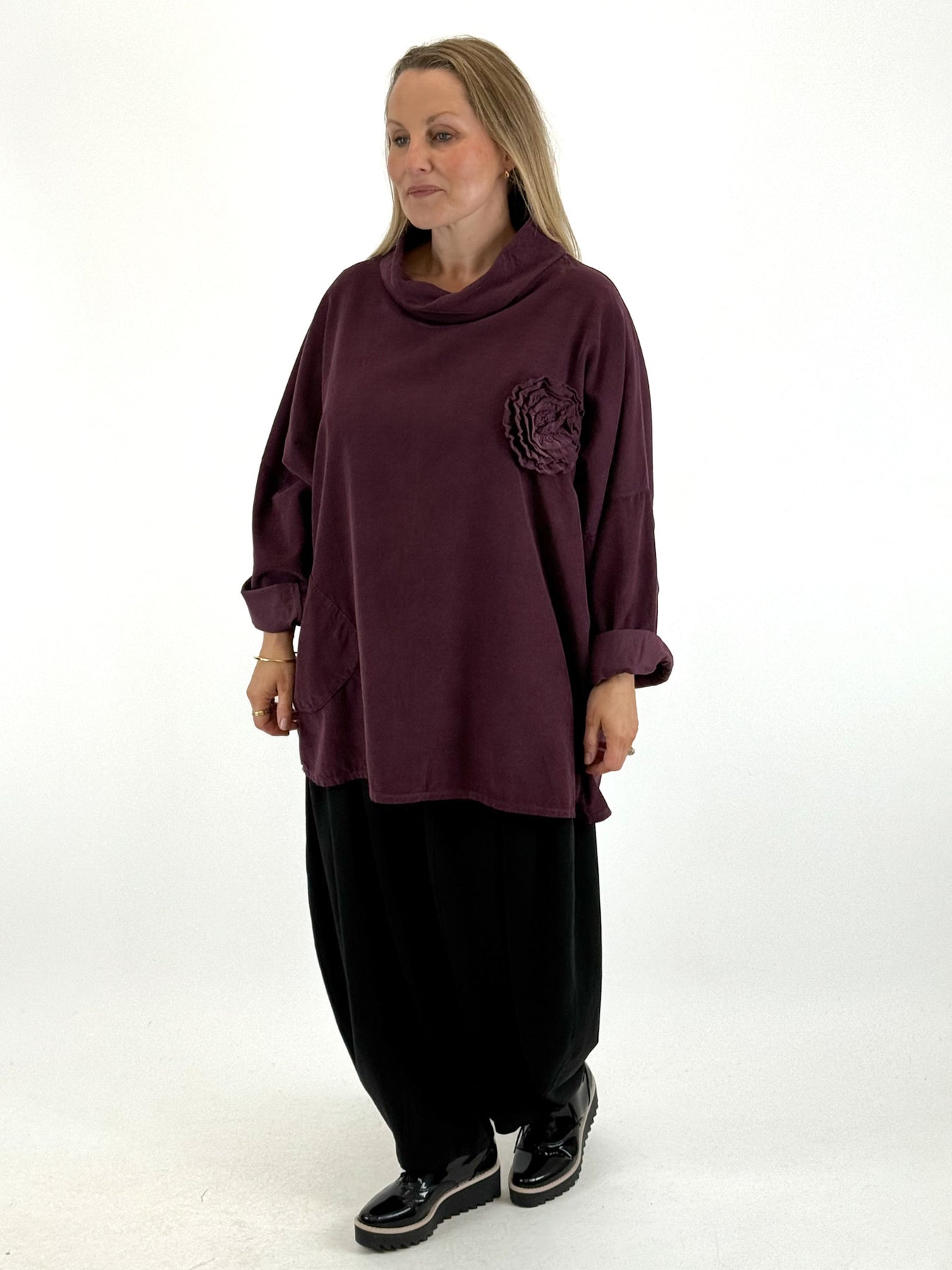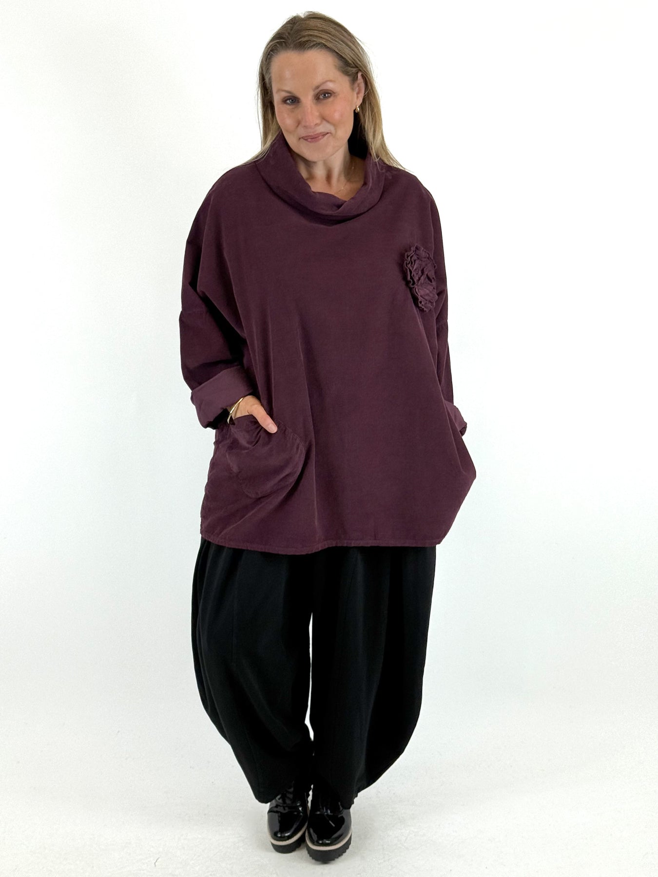 Our beautiful Cowl Neck Top is a must have easy go to for the winter months ahead. A plain cotton corduroy top short block for when the simplest of tops is needed to wear with ease. Has a flower detail, one pocket on the front.