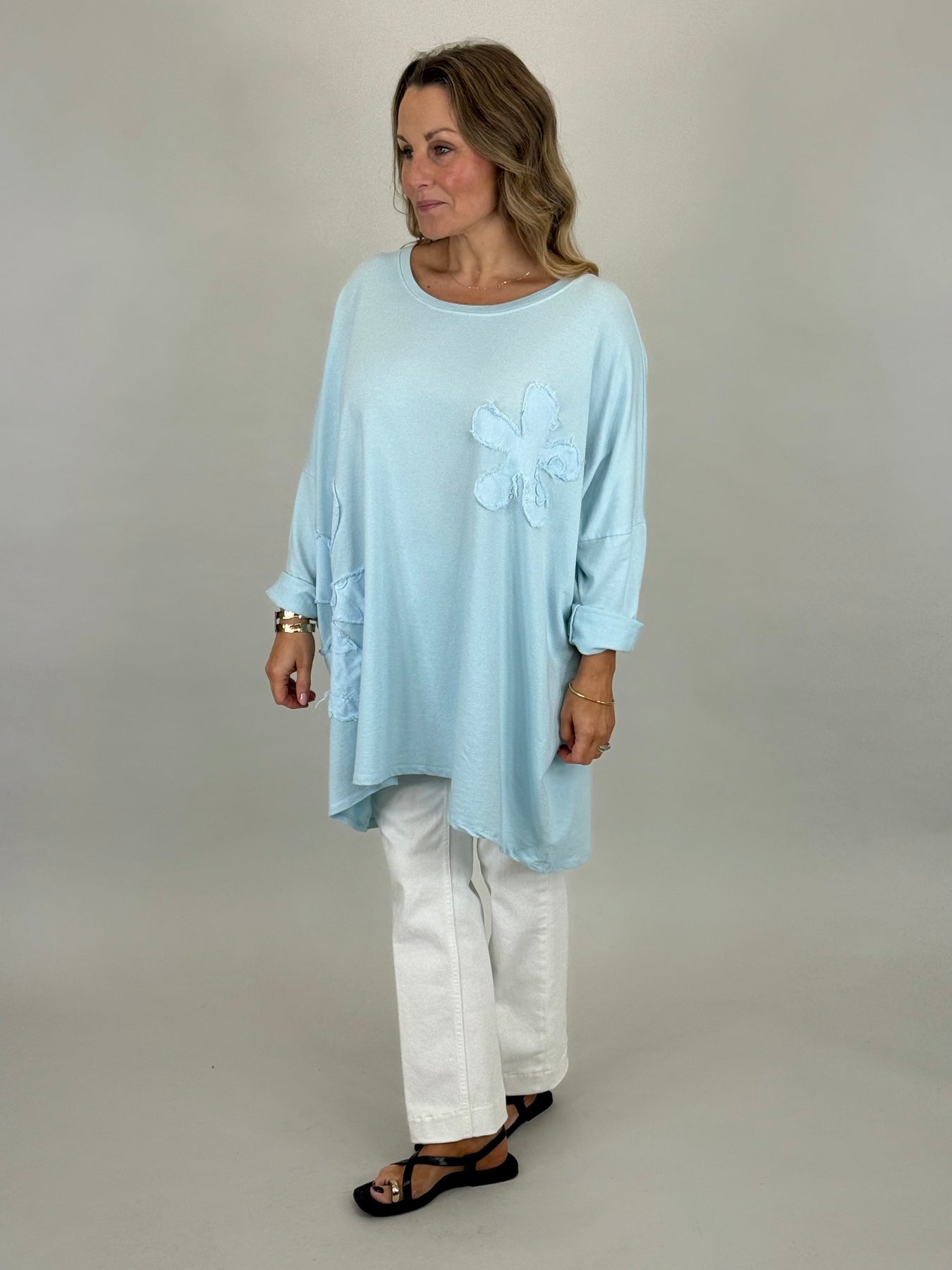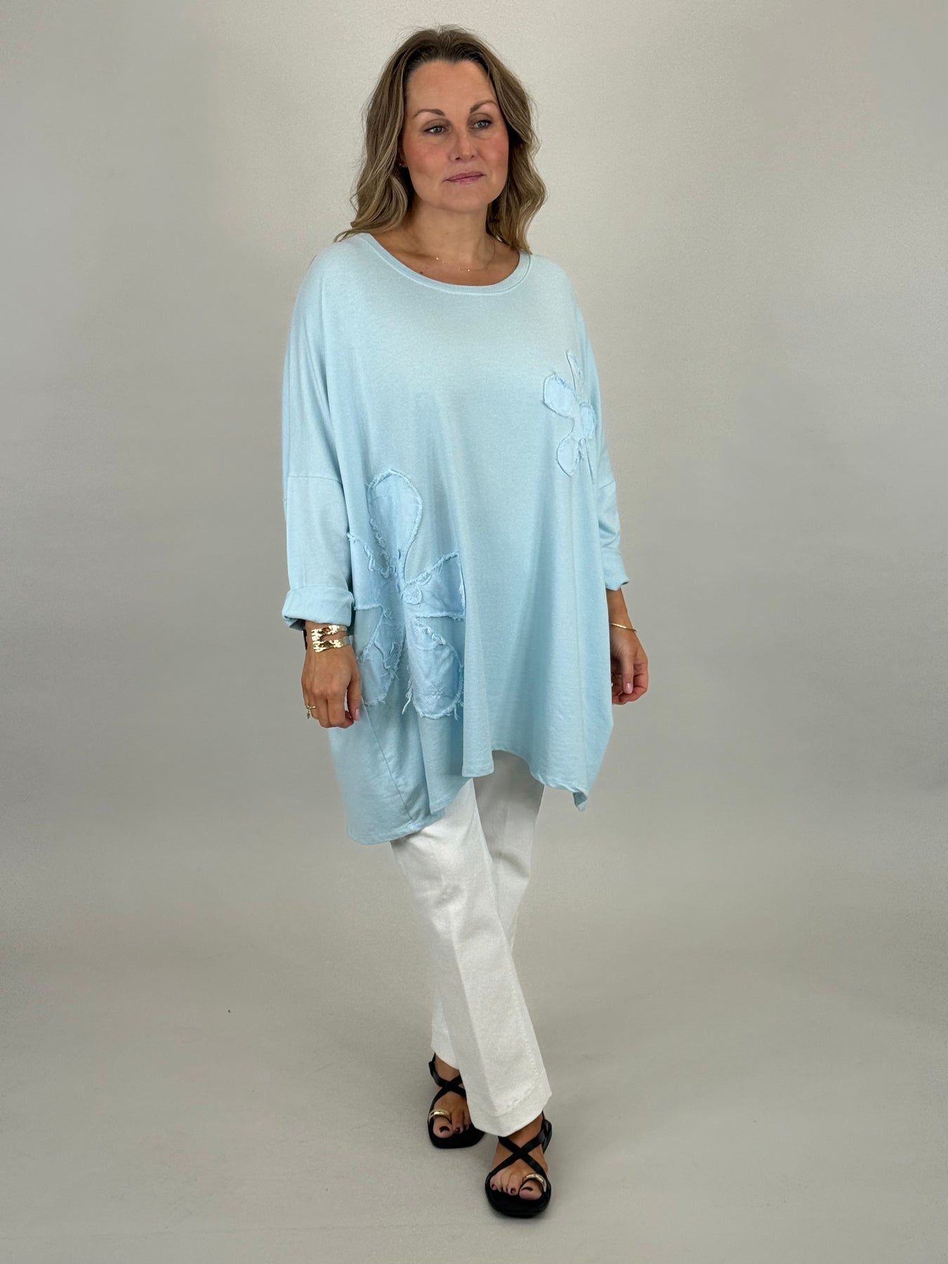 Soft, comfortable, and perfect for the warmer months, this cotton summer sweatshirt is designed in a simple Lagenlook style for effortless everyday style. Made from super soft cotton, it features a beautiful flower patch detail in broderie anglaise fabric, adding a feminine, textured finish.