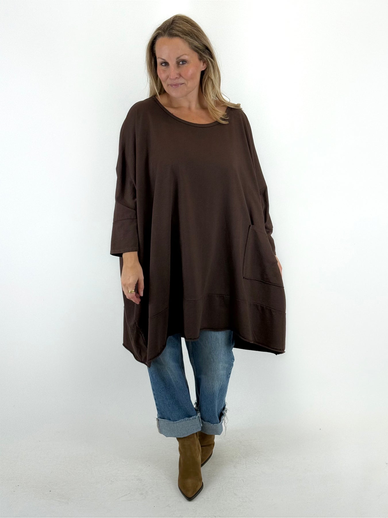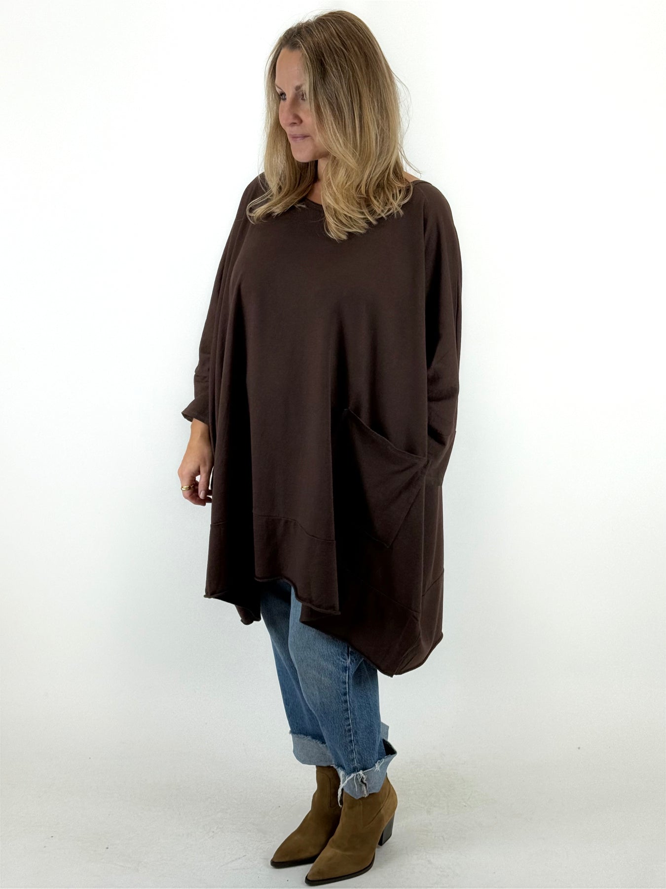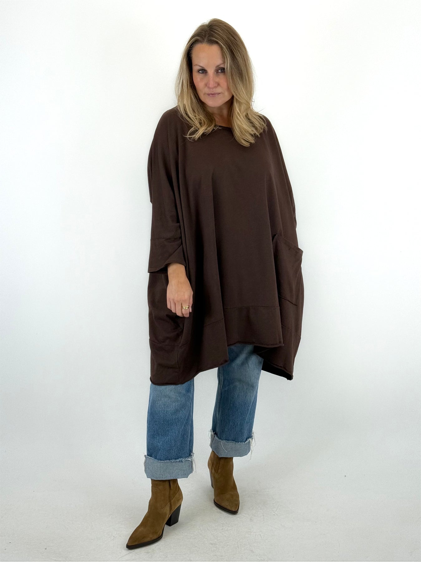 - Made in Italy Lagenlook Emily Oversized Pocket Sweatshirt in Chocolate. 00238