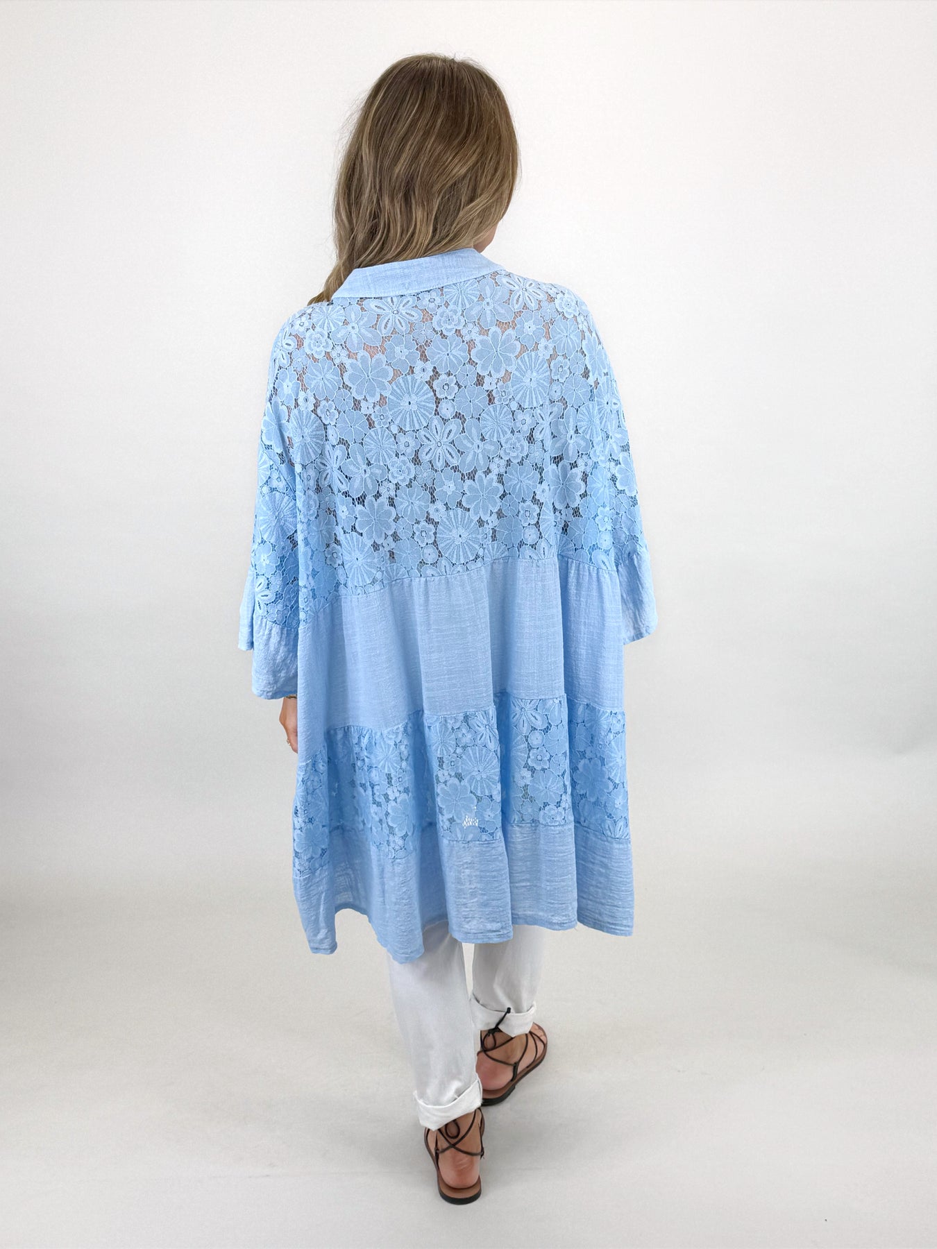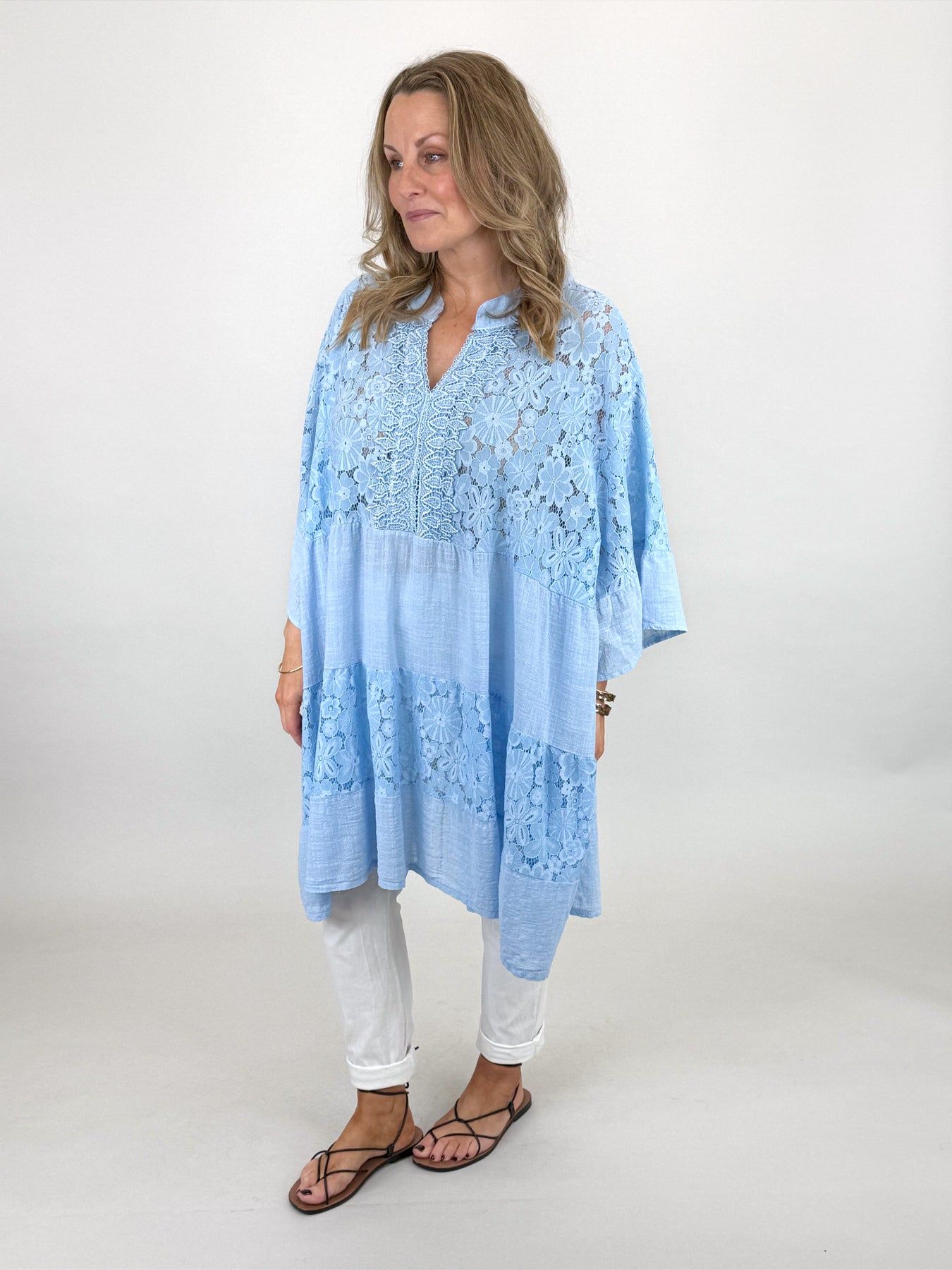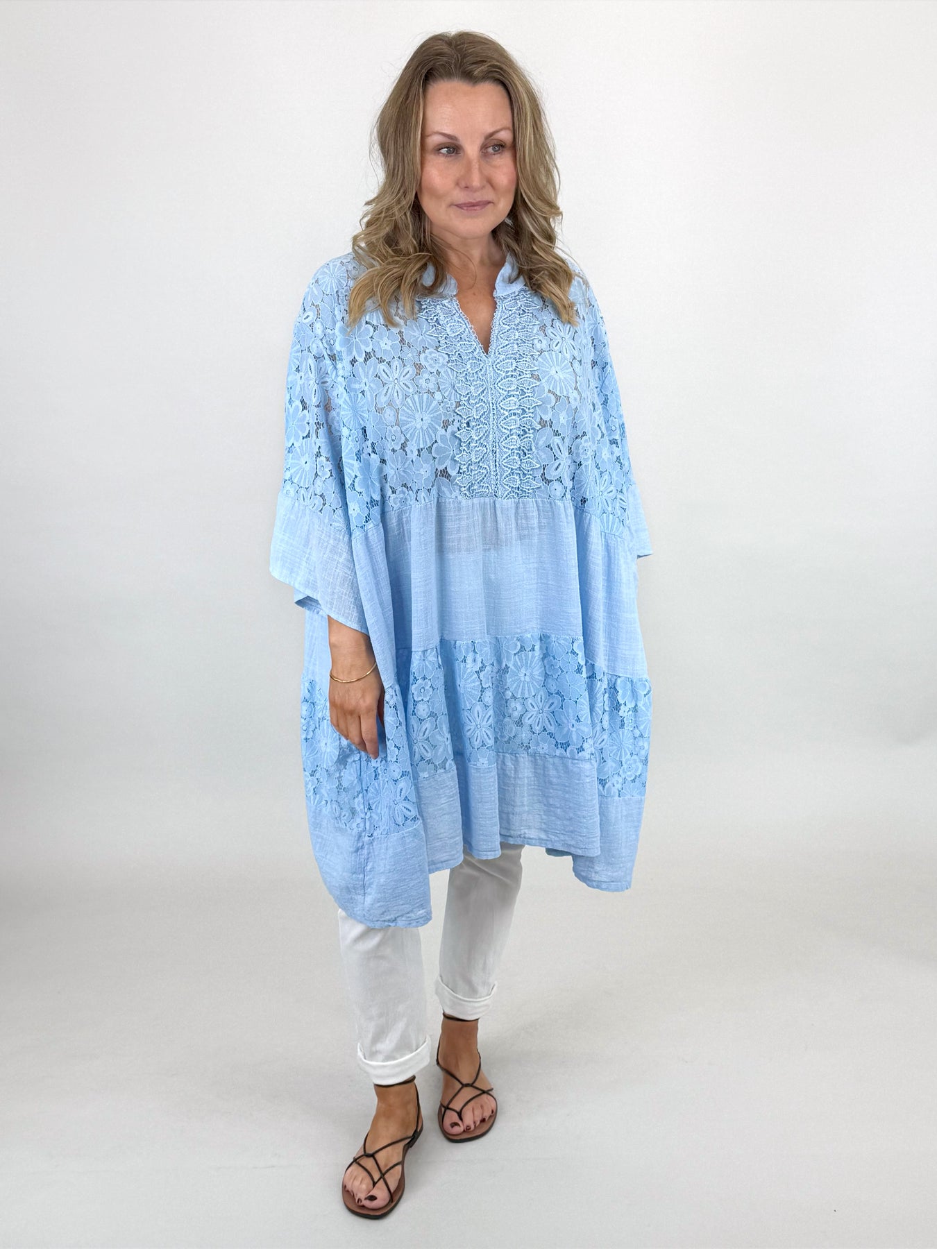 Lagenlook Palermo Lace V- Neck Top | Sky Blue. 91268