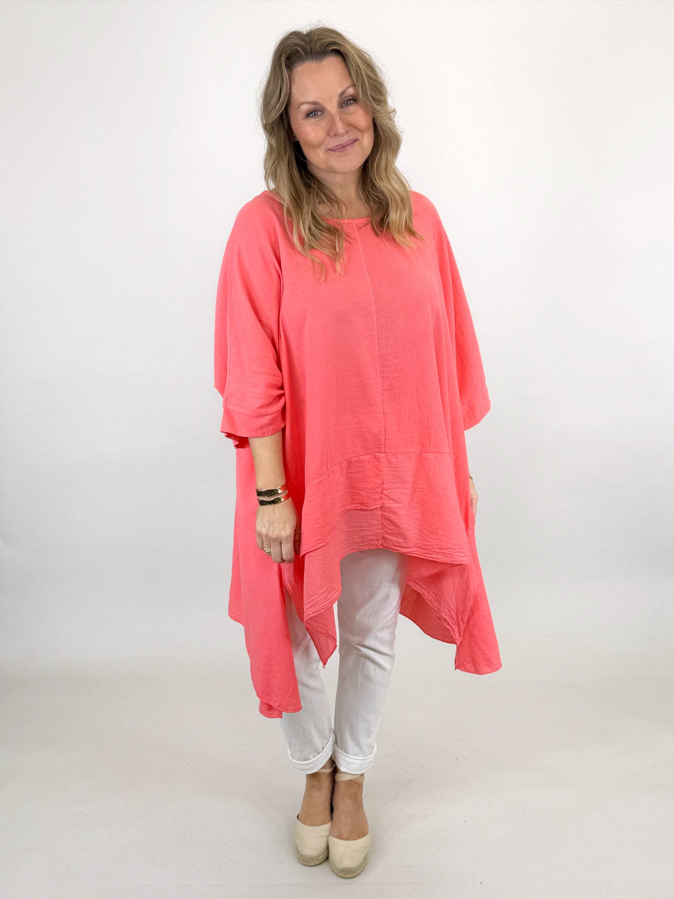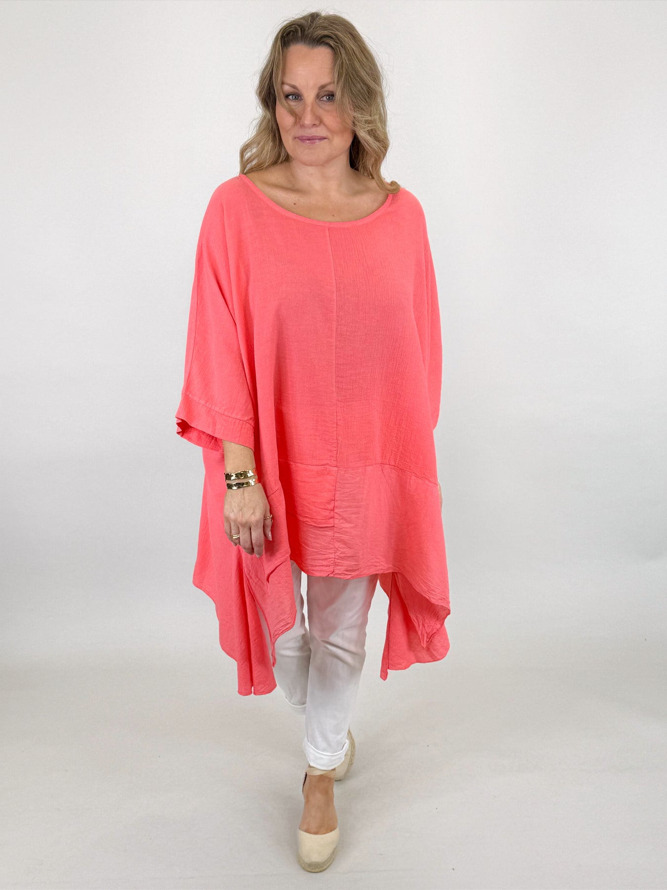 Our beautiful Lagenlook Kim Cotton Top is back. Cut from 100% Italian cotton tailored for a boho drape that looks so stylish. Longer fall on sides