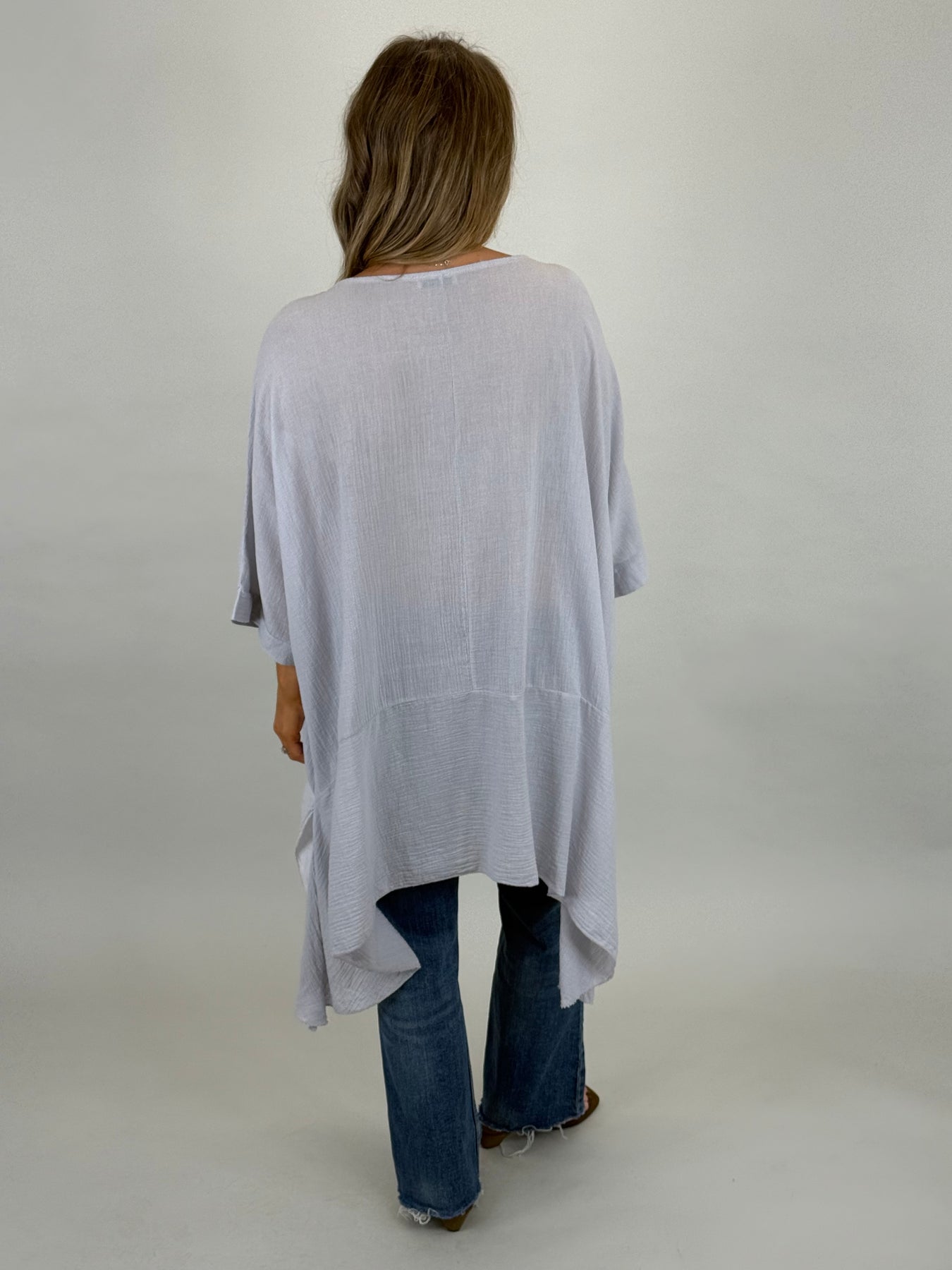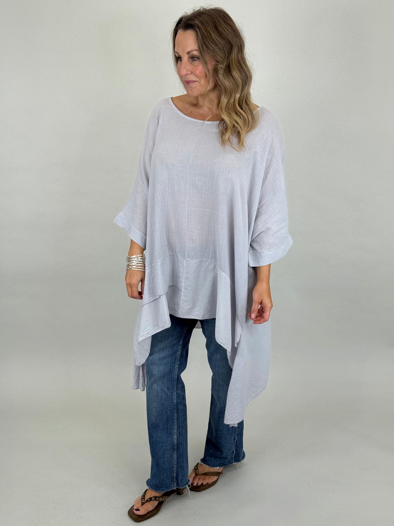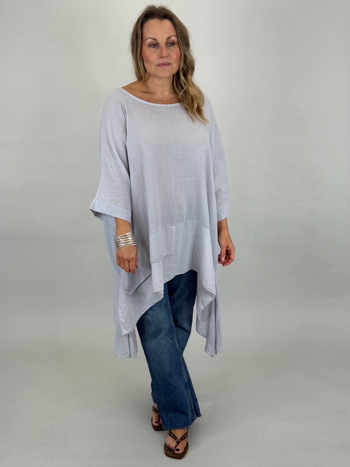 Our beautiful Lagenlook Kim Cotton Top is back. Cut from 100% Italian cotton tailored for a boho drape that looks so stylish. Longer fall on sides