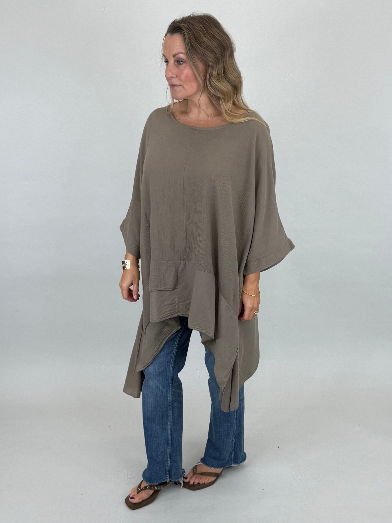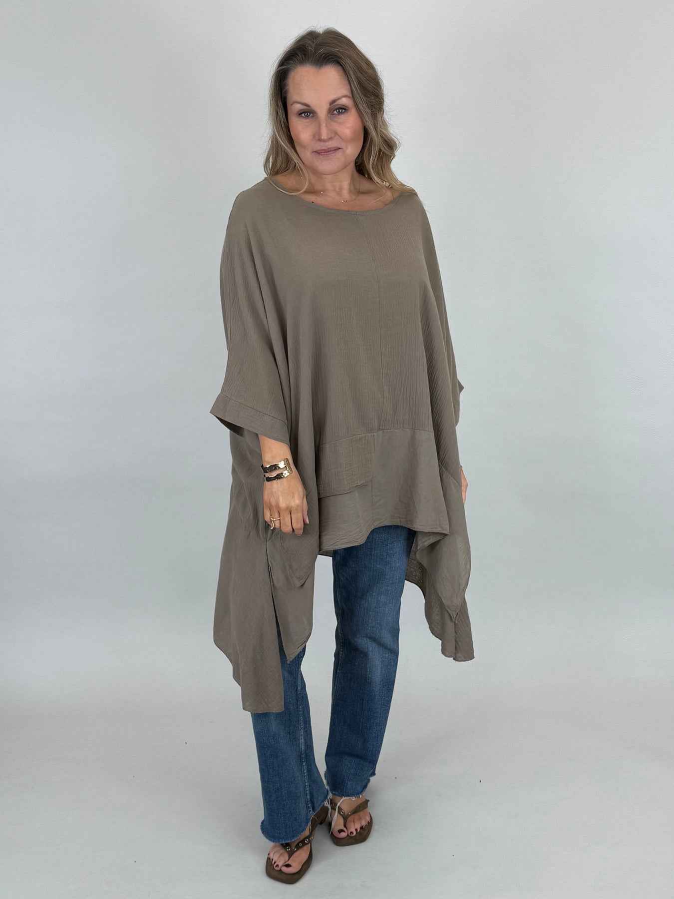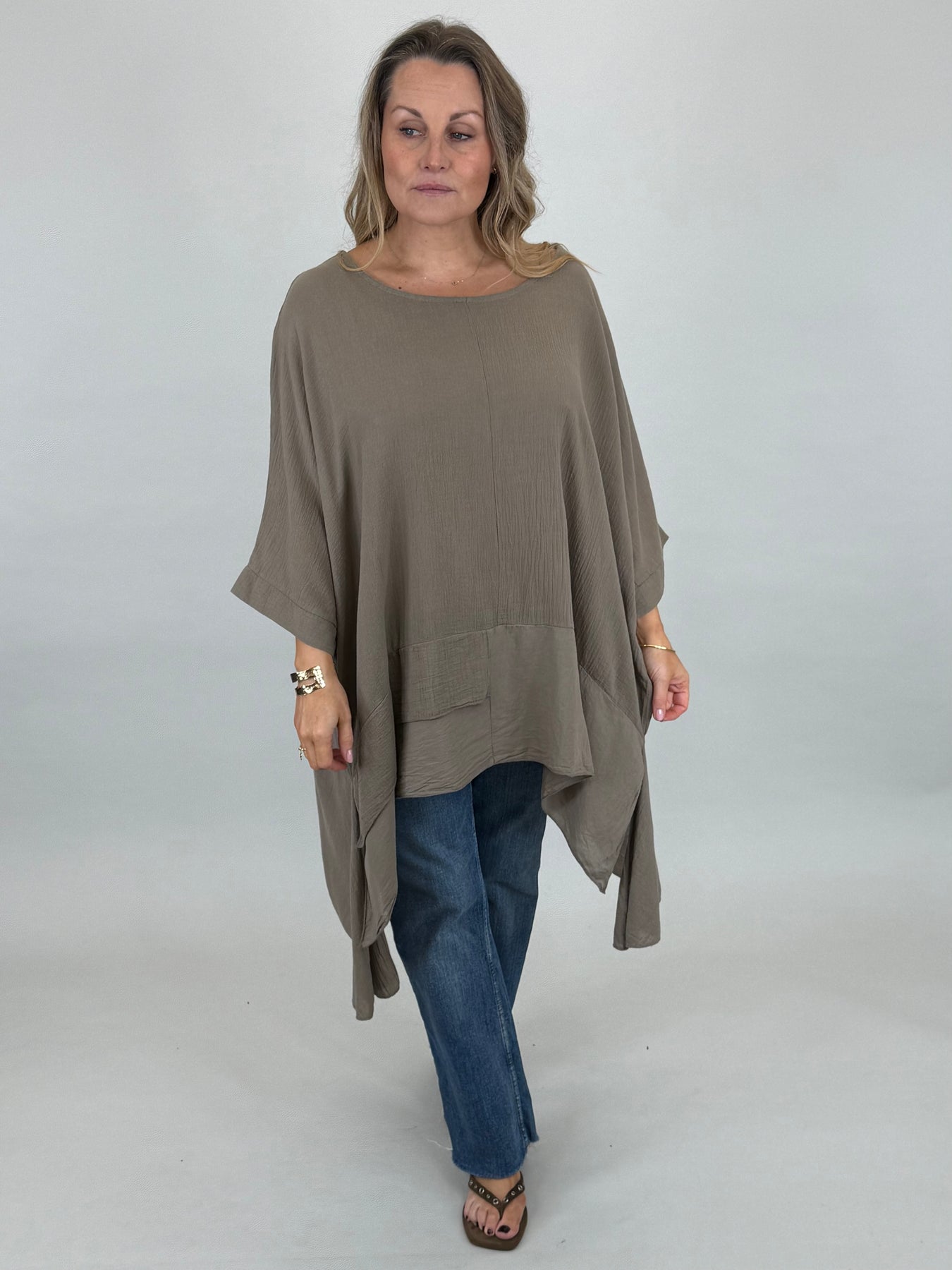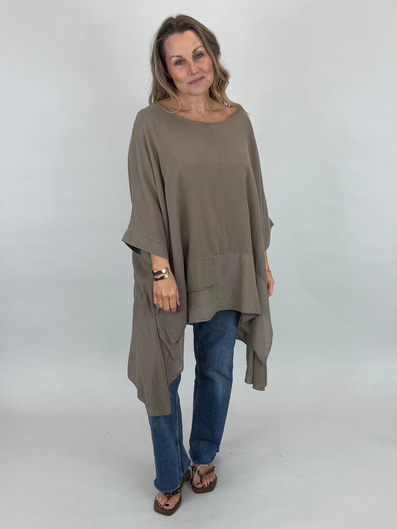 Our beautiful Lagenlook Kim Cotton Top is back. Cut from 100% Italian cotton tailored for a boho drape that looks so stylish. Longer fall on sides