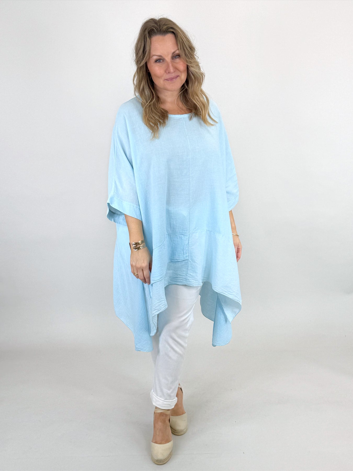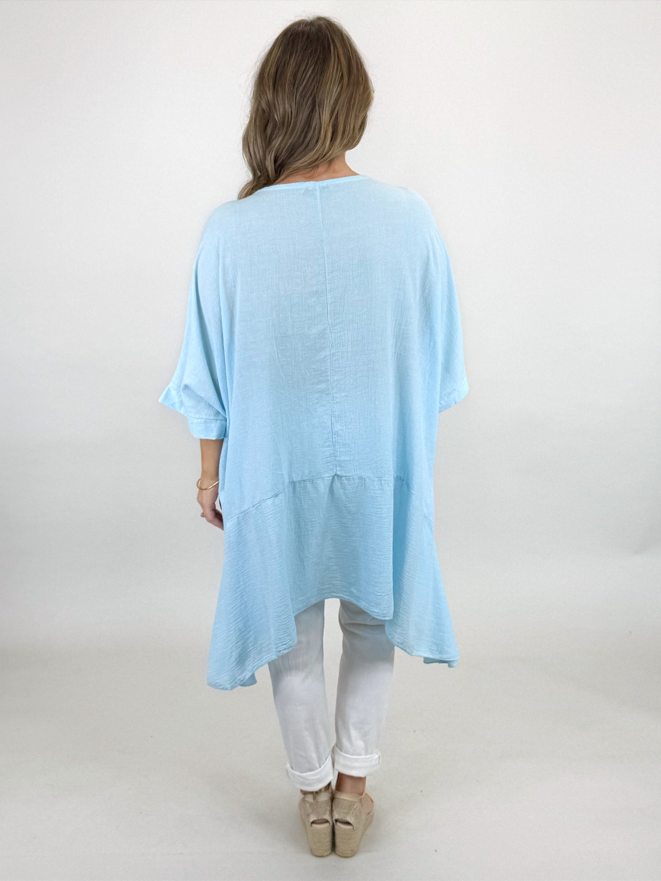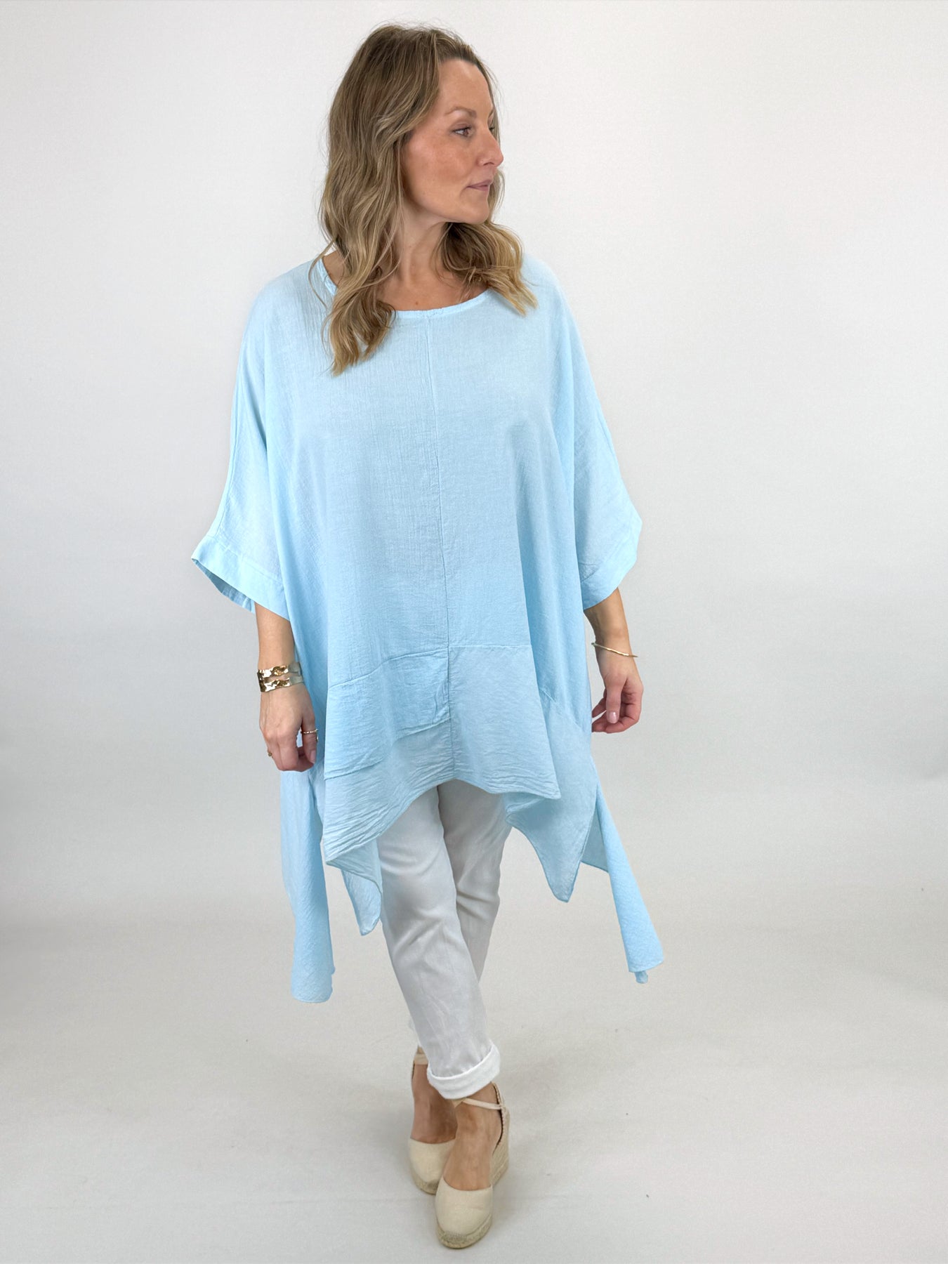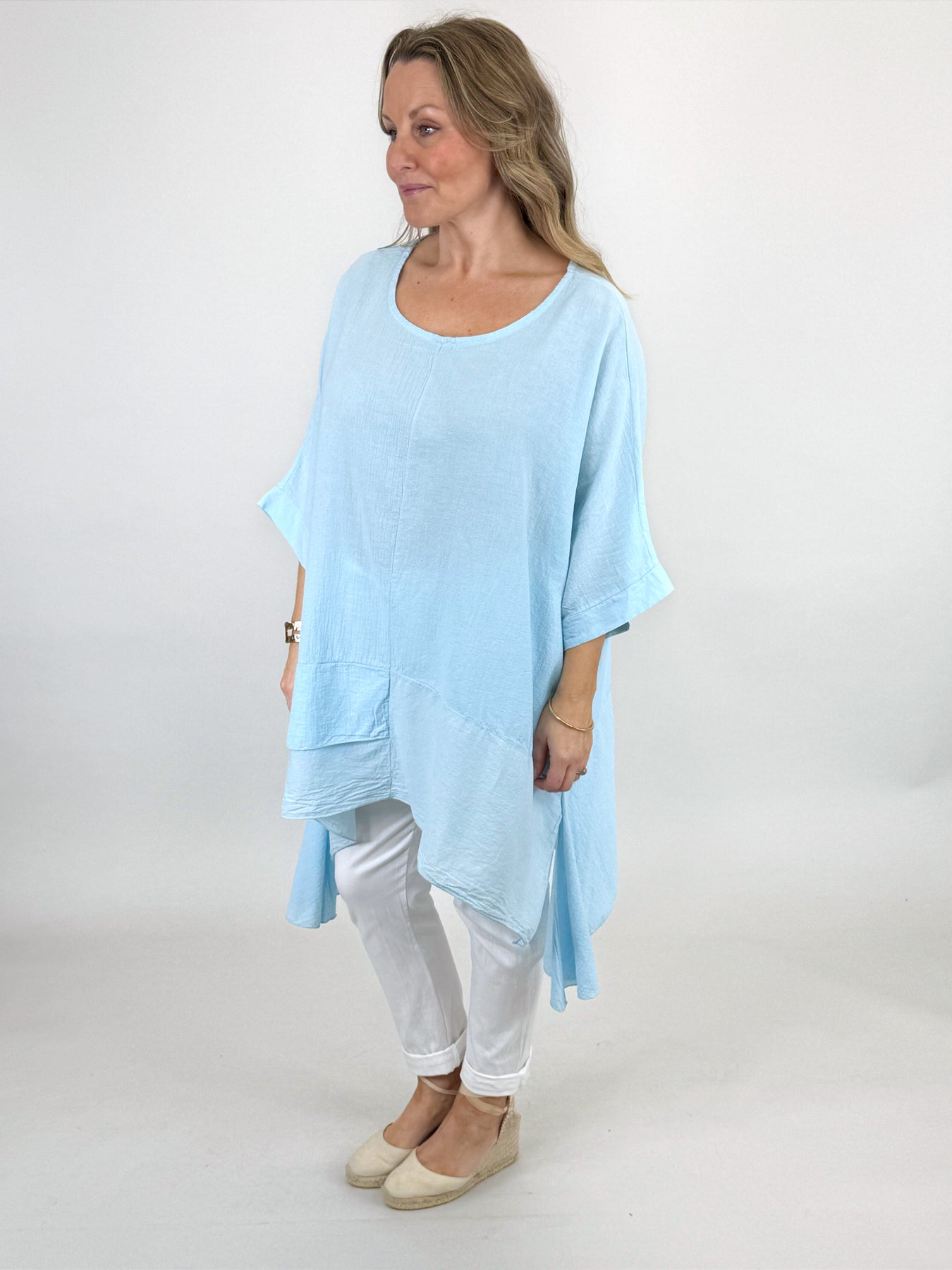 Our beautiful Lagenlook Kim Cotton Top is back. Cut from 100% Italian cotton tailored for a boho drape that looks so stylish. Longer fall on sides
