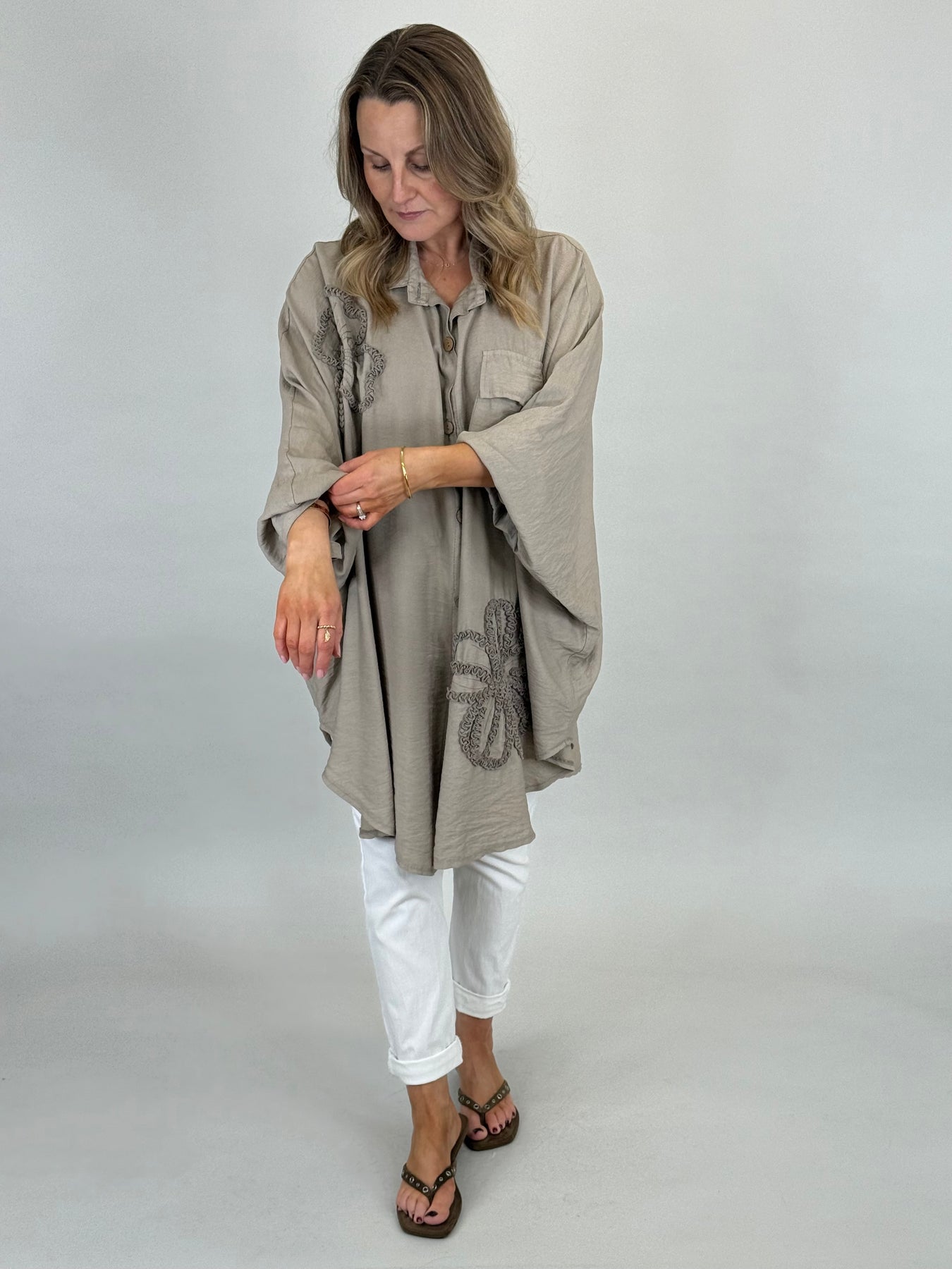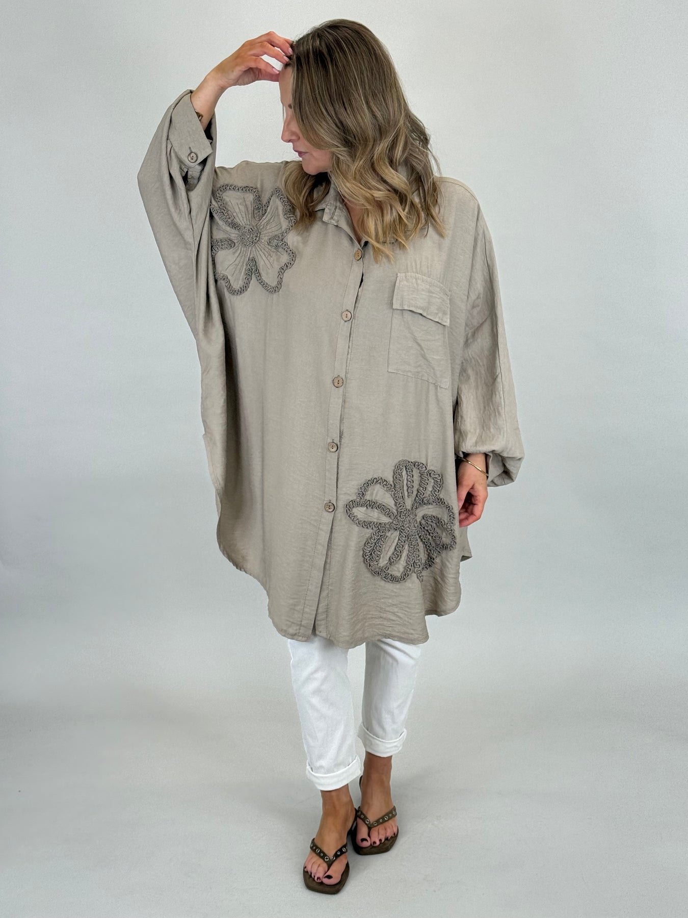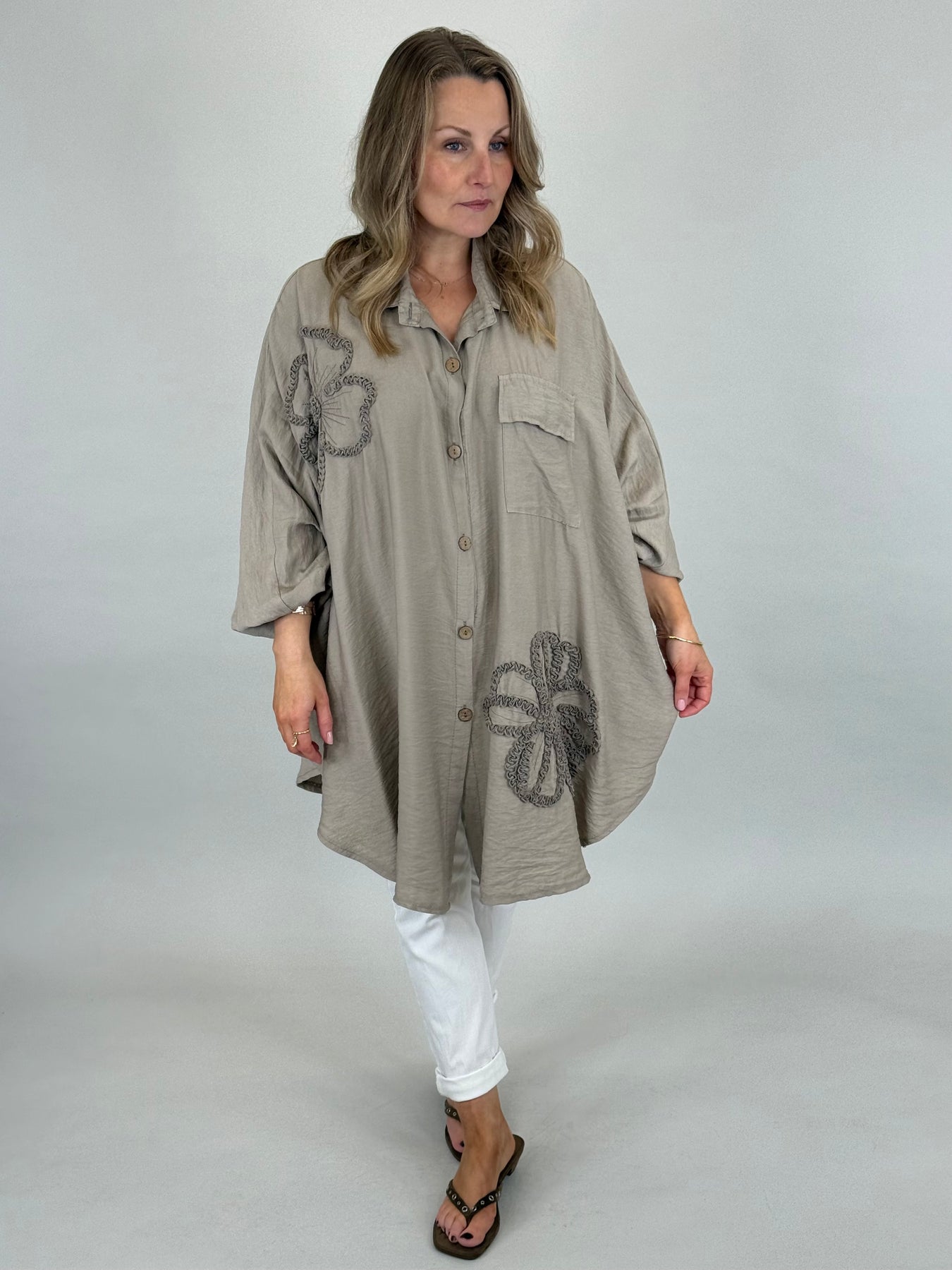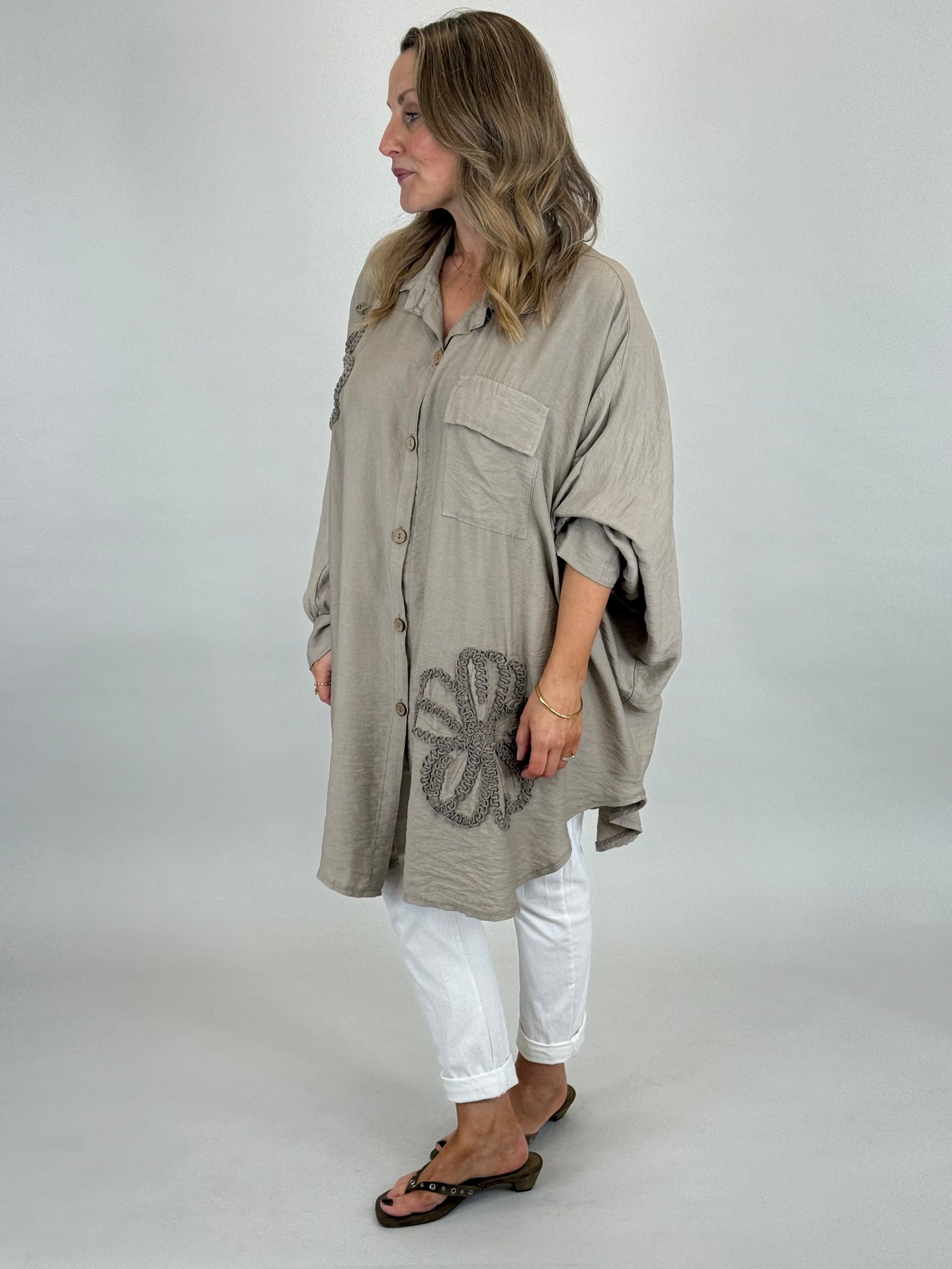 Our beautiful Langdon Lagenlook Button Shirt Tunic is a must have easy go to for the warmer months ahead, Tonal Flower detail, a beautiful silky viscose that allows this top to be both casual and smart.