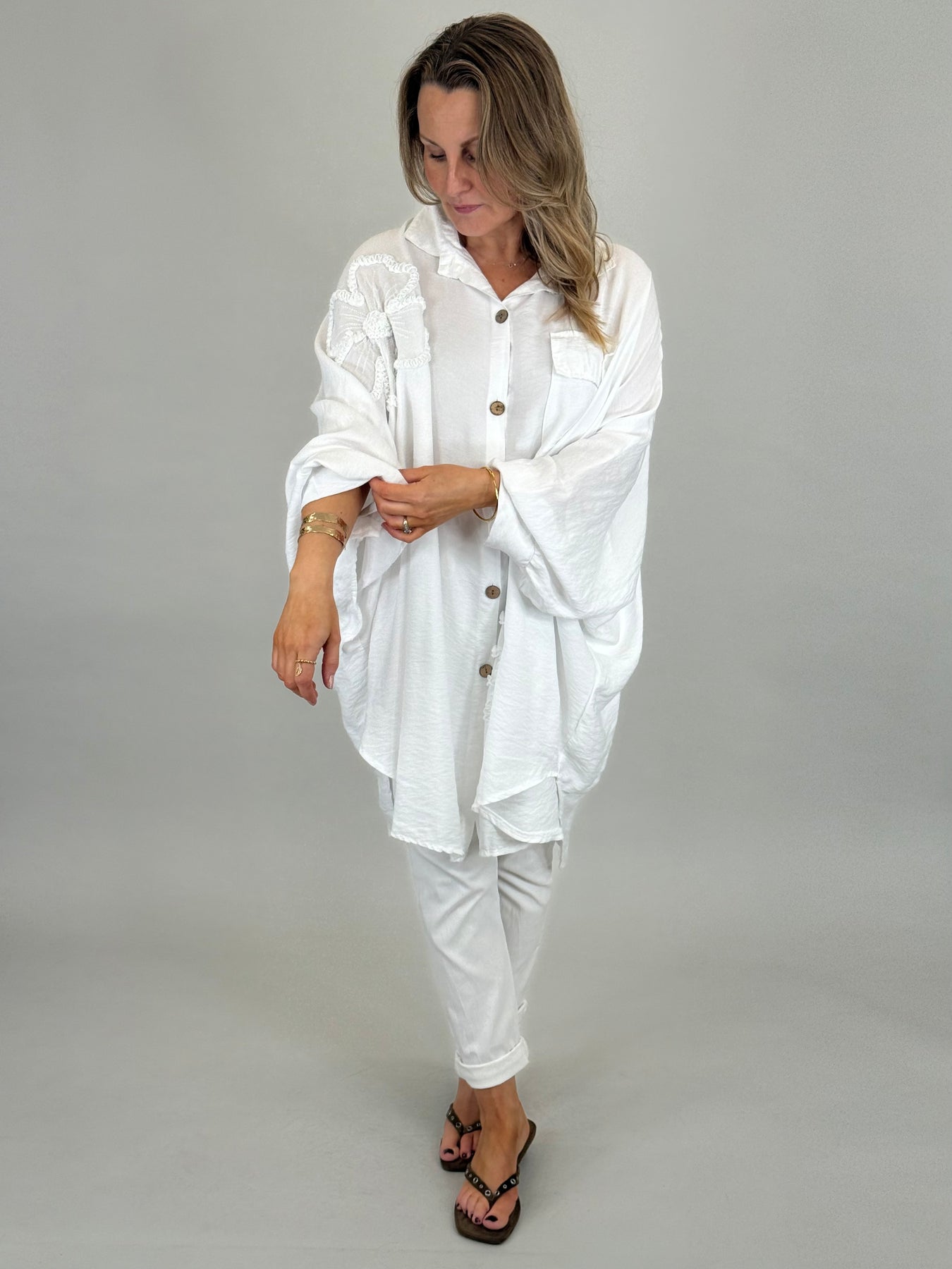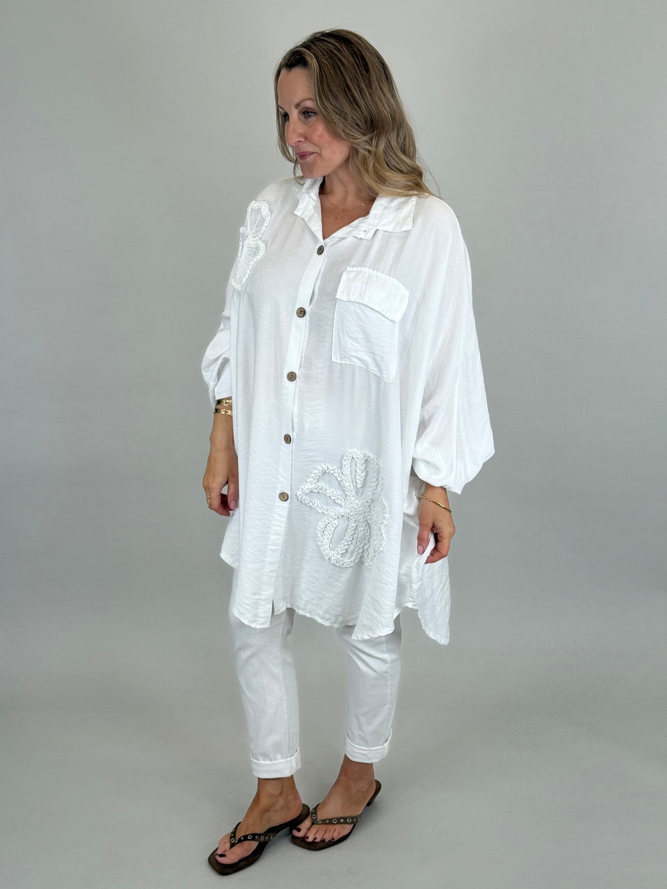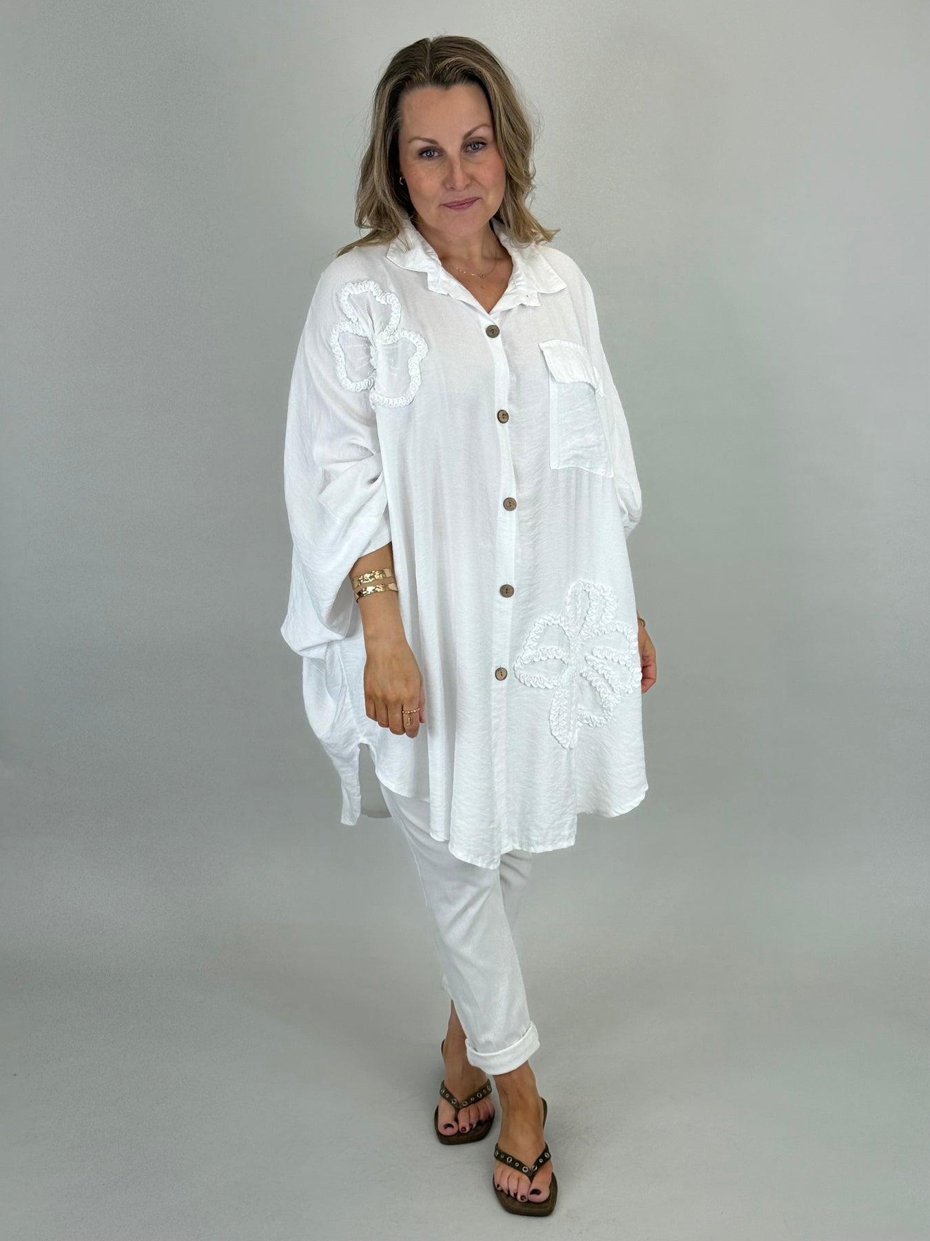 Our beautiful Langdon Lagenlook Button Shirt Tunic is a must have easy go to for the warmer months ahead, Tonal Flower detail, a beautiful silky viscose that allows this top to be both casual and smart.
